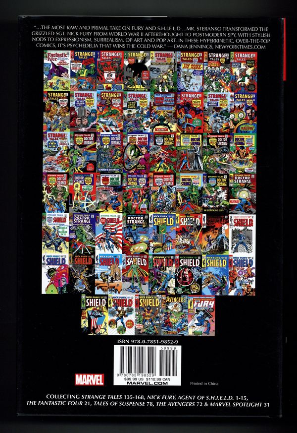Alex Ross Cover - 1st printing. Collects Nick Fury Agent of SHIELD (1968-1971 1st Series) #1-15, Fantastic Four (1961-1996 1st Series) #21, Tales of Suspense (1959-1968) #78, Avengers (1963-1996 1st Series) #72, Marvel Spotlight (1971-1977 1st Series) #31 and material from Strange Tales (1951-1976 1st Series) #135-168 and Not Brand Echh (1967-1969) #3, 8 and 11. We are proud to present, in a single complete volume, one of the Marvel's most-innovative series-S.H.I.E.L.D.! With international threats on the rise, Tony Stark and a council of global powers tapped Nick Fury to protect the us from Hydra, A.I.M., Baron Strucker and the Yellow Claw. The greatest team in comics, Stan Lee & Jack Kirby, dove into the world of covert ops, mixing Cold War drama with the mighty Marvel manner. They set the tone, but when Steranko took over, he rewrote the entire rulebook. Steranko turned S.H.I.E.L.D. into one of the most visually innovative comic books ever published and every issue, every story is presented in oversized glory! You've been granted Priority A-1 access, so reserve your copy today! Hardcover, 960 pages, full color. Cover price $99.99.