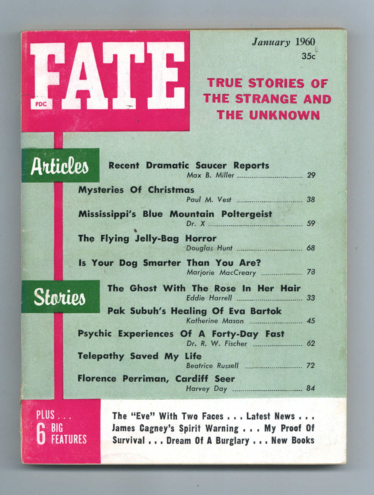 Volume 13 - Number 1, January 1960. Pulp magazine devoted to exploring the paranormal. Articles include Mysteries of Christmas by Paul M. Vest, Mississippi's Blue Mountain Poltergeist by Dr. X, and the Flying Jelly-Bag Horror by Douglas Hunt! Stories include The Ghost with the Rose in her Hair by Eddie Harrell, Telepathy Saved my Life by Beatrice Russell, and Florence Perriman, Cardiff Seer by Harvey Day. Softcover, 5 1/2-in. x 7 1/2-in., 130 page, Text (with B&W Illustrations and Photos). Cover price $0.35.