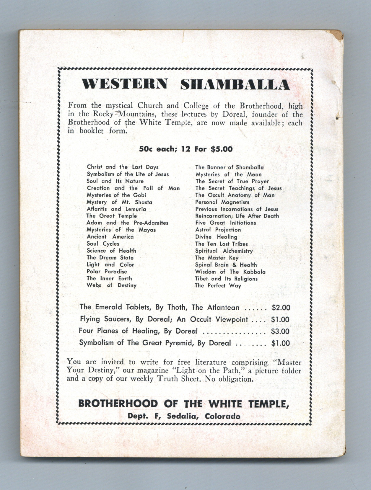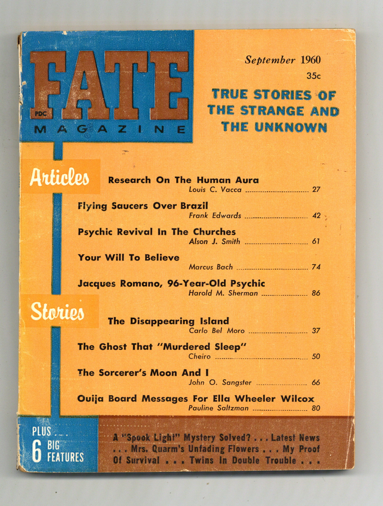 Volume 13 - Number 9, September 1960. Pulp magazine devoted to exploring the paranormal. Articles include The Church of England Reporting on Spiritual Healing by Fred Archer, You, Too, Can be A Yogi by Jerru Victor, and Our Lives in Two Worlds by James Crenshaw. Stories include Warnign on the Mirror by Cheiro, Death Wears Johnny's Face by Erna Elliot, and The Cursed House on Caldwell Street by Laura Brilliant. Softcover, 5 1/2-in. x 7 1/2-in., 130 page, Text (with B&W Illustrations and Photos). Cover price $0.35.