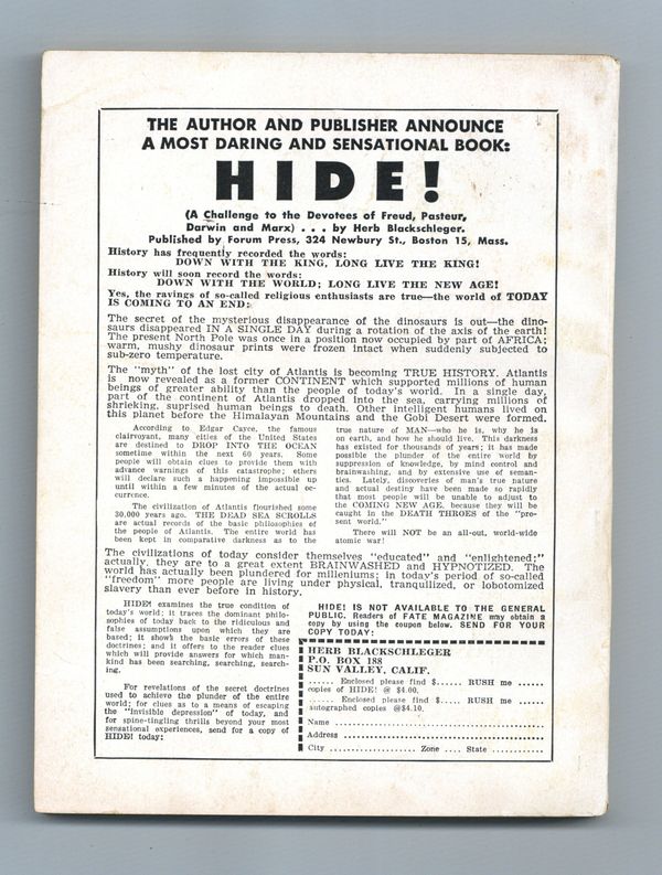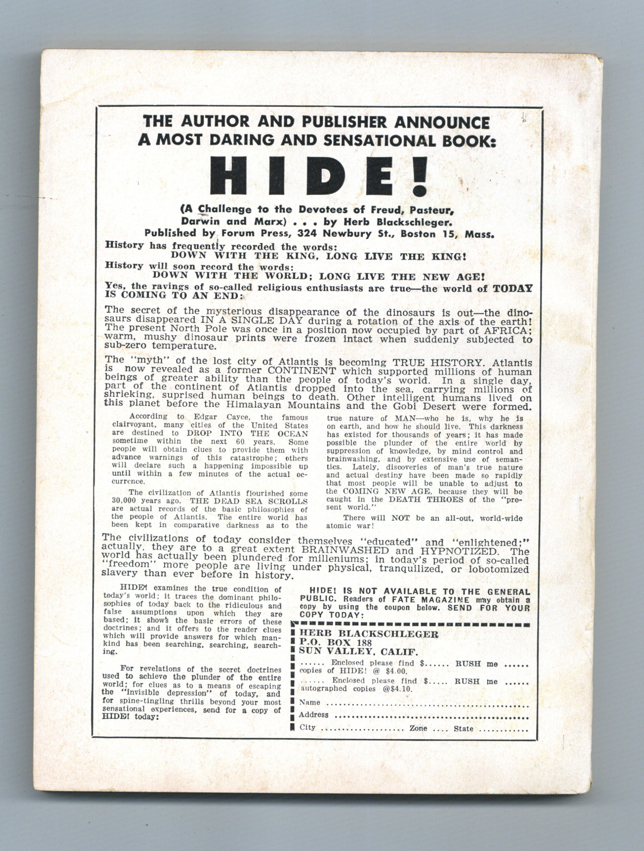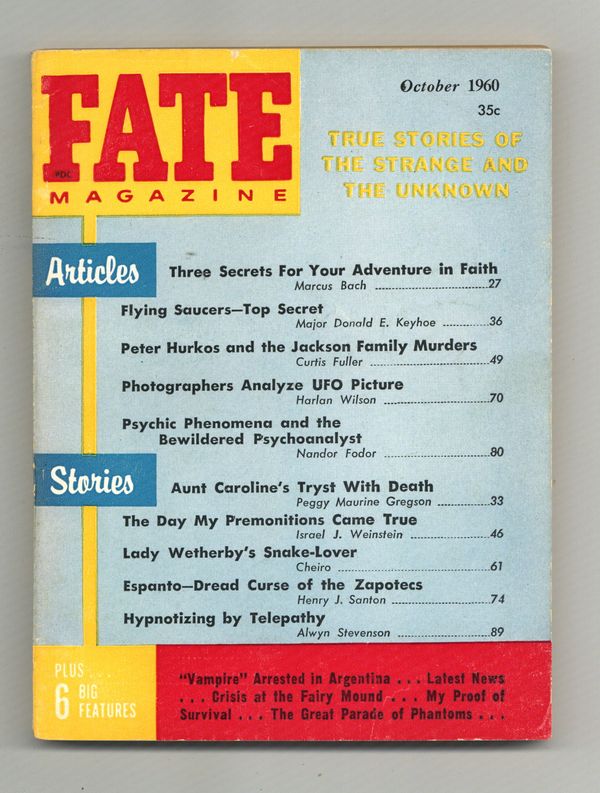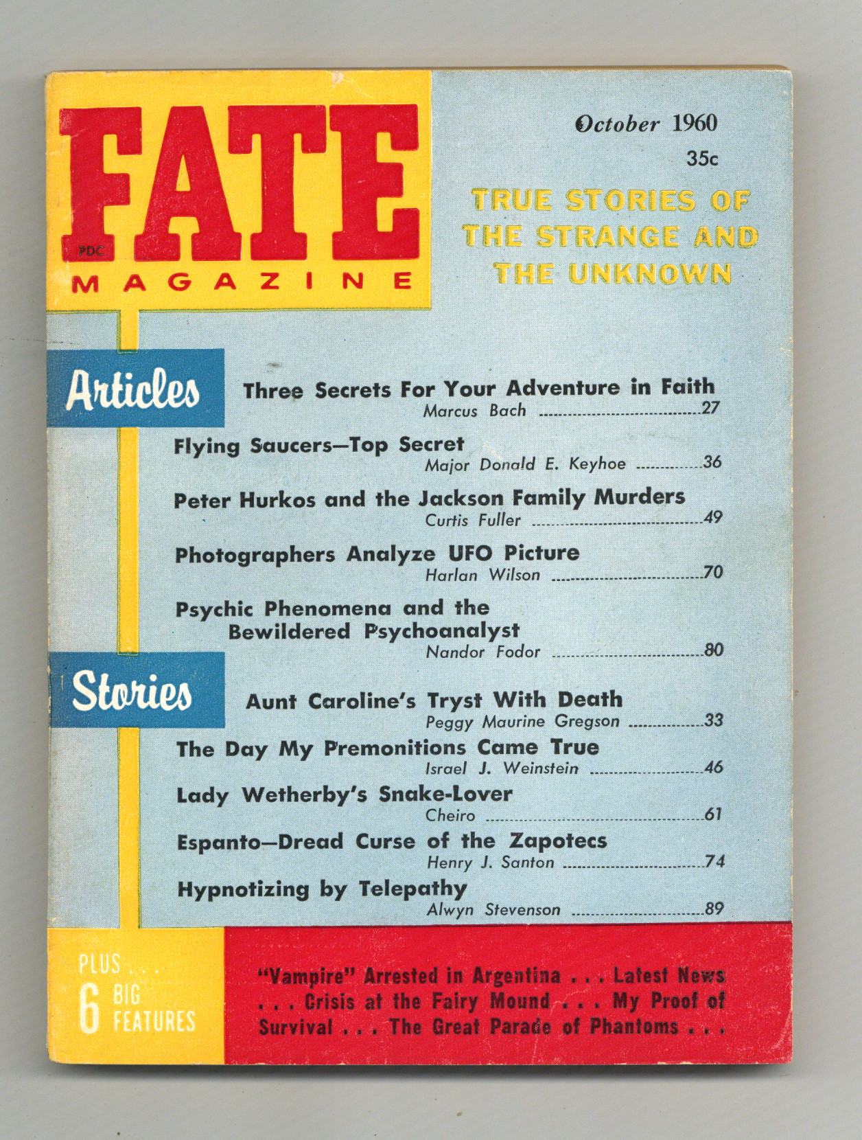 Volume 13 - Number 10, October 1960. Pulp magazine devoted to exploring the paranormal. Articles include Three Secrets for your Adventure in Faith by Marcus Bach, Peter Hurkos and the Jackson Family Murders by Curtis Fuller, and {hotographrs Analyse UFO Pictures by Harlan Wilson. Stories include Aunt Caroline's Tryst with Death by Peggy Maurine Gregson, The Day My Premonitions Came True by Israel J. Weinstein, and Espanta - Dread Curse of the Zapotecs by Henry J. Santon. Softcover, 5 1/2-in. x 7 1/2-in., 130 page, Text (with B&W Illustrations and Photos). Cover price $0.35.