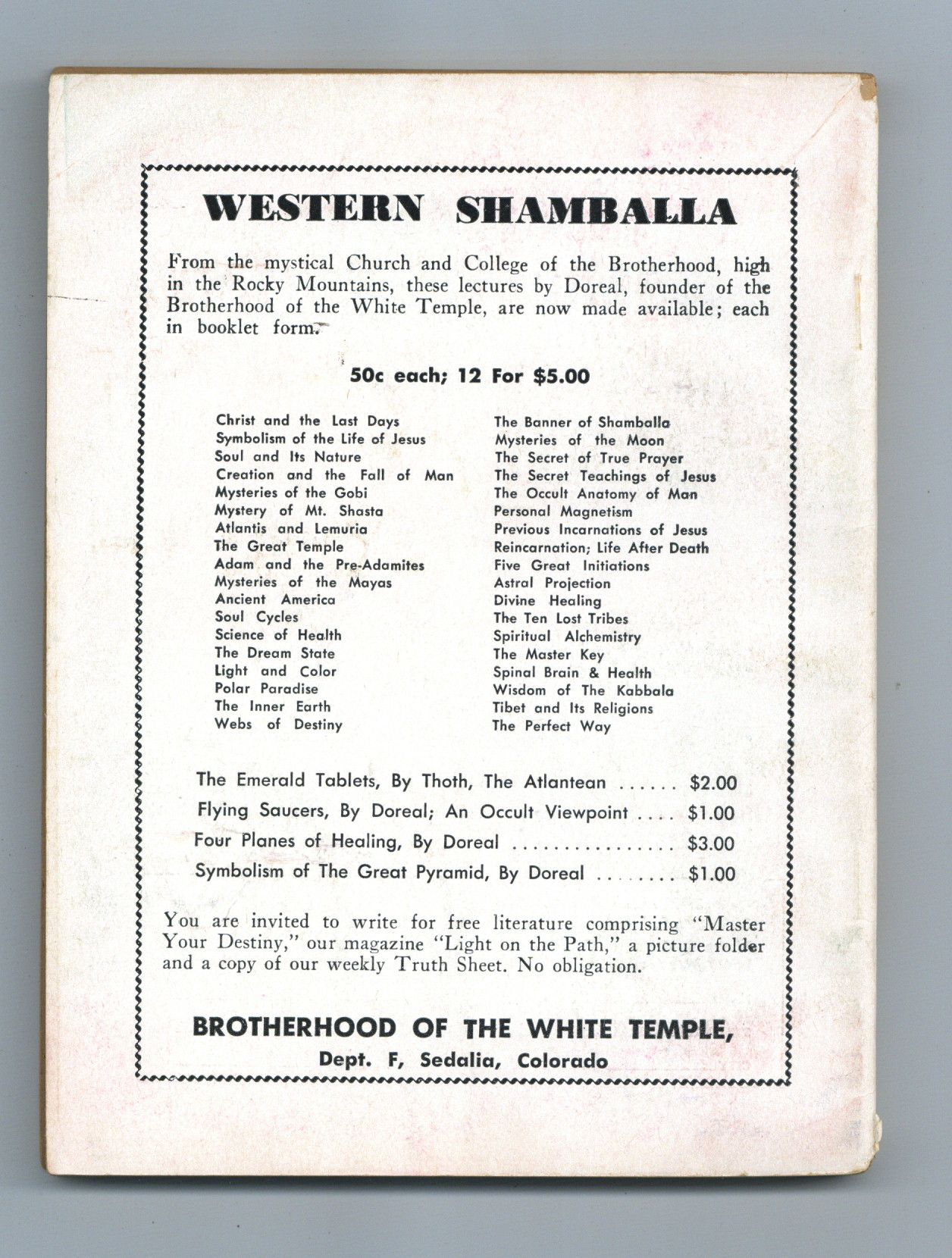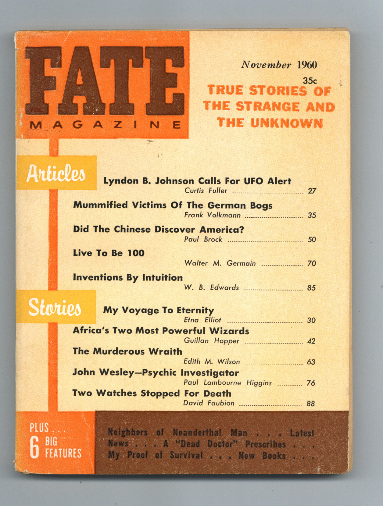 Published Nov 1960 by Clark Publishing Company.$4.00Volume 13 - Number 11, November 1960. Pulp magazine devoted to exploring the paranormal. Articles include Lyndon B. Johnson Call for UFO Alert by Curtis Fuller, Mummified Victims of the German Bogs by Frank Volkman, and Inventions by Intuition by W.B. Edwards. Stories include My Voyage to Eternity by Etna Elliot, The Murderous Wraith by Edith M. Wilson, and Two Watches Stopped for Death by David Faubion. Softcover, 5 1/2-in. x 7 1/2-in., 130 page, Text (with B&W Illustrations and Photos). Cover price $0.35.