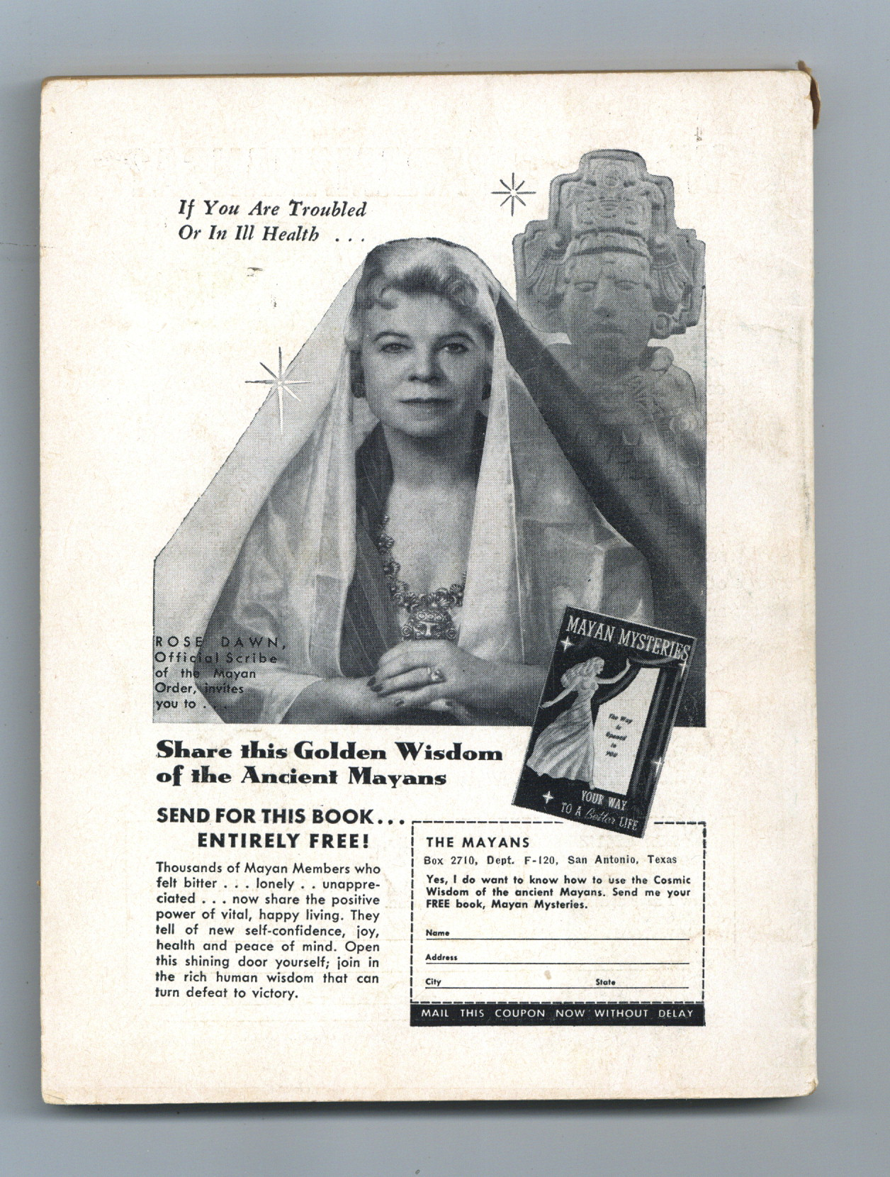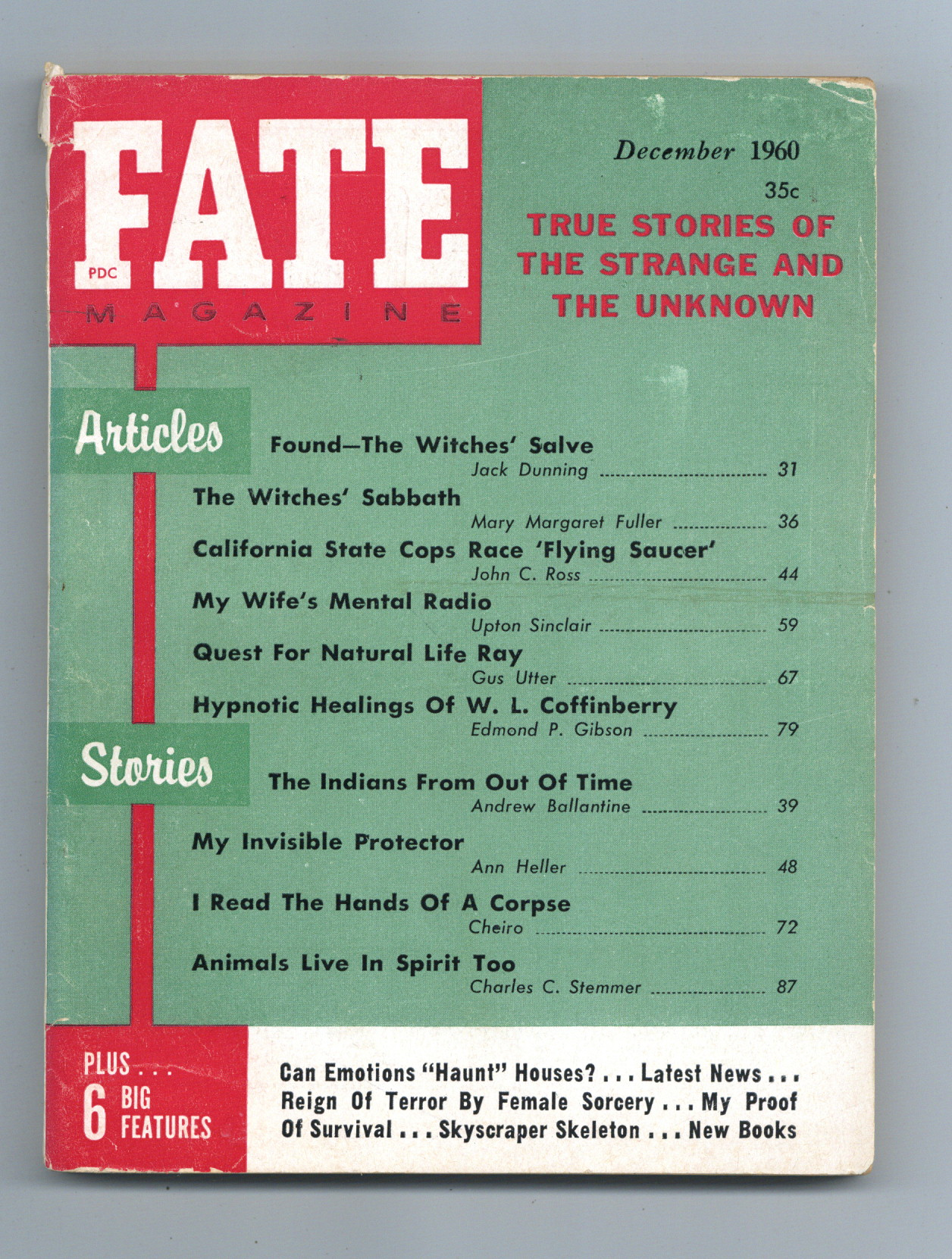 Volume 13 - Number 12, December 1960. Pulp magazine devoted to exploring the paranormal. Articles include Found The Witches's Salve by Jack Dunning, Quest for Natural Life Ray by Gus Utter, and Hypnotic Healings of W.L. Coffinberry by Edmond P. Gibson. Stories include The Indians From Out of Time by Andrew Ballantine, My Invisible Protector by Ann Heller, and I Read the Hands of a Corpse by Cheiro. Softcover, 5 1/2-in. x 7 1/2-in., 130 page, Text (with B&W Illustrations and Photos). Cover price $0.35.