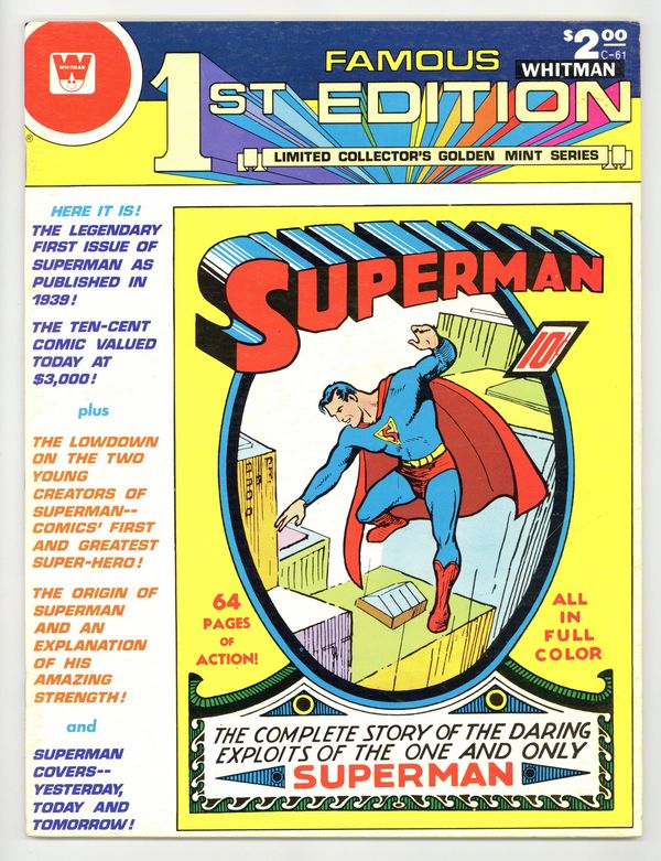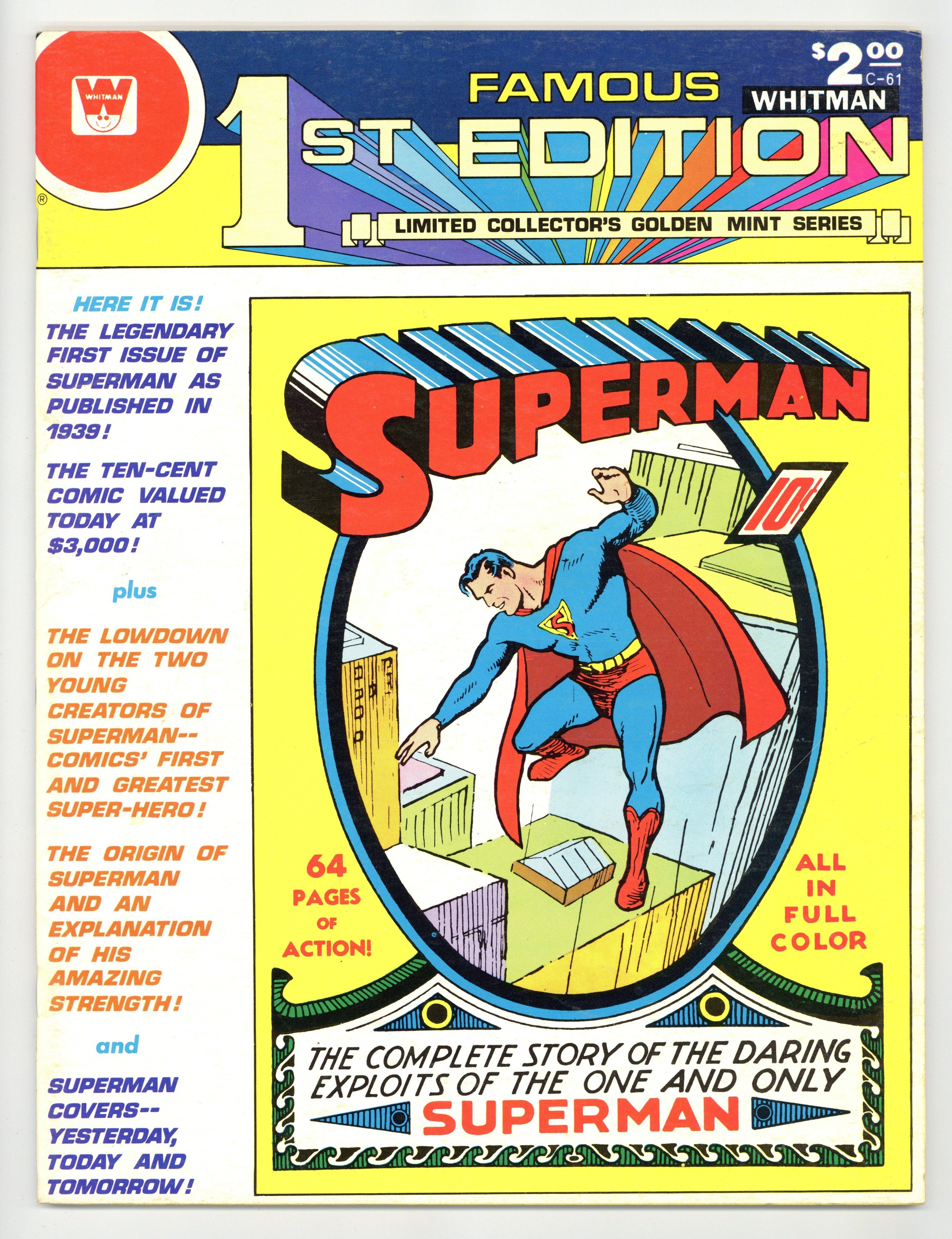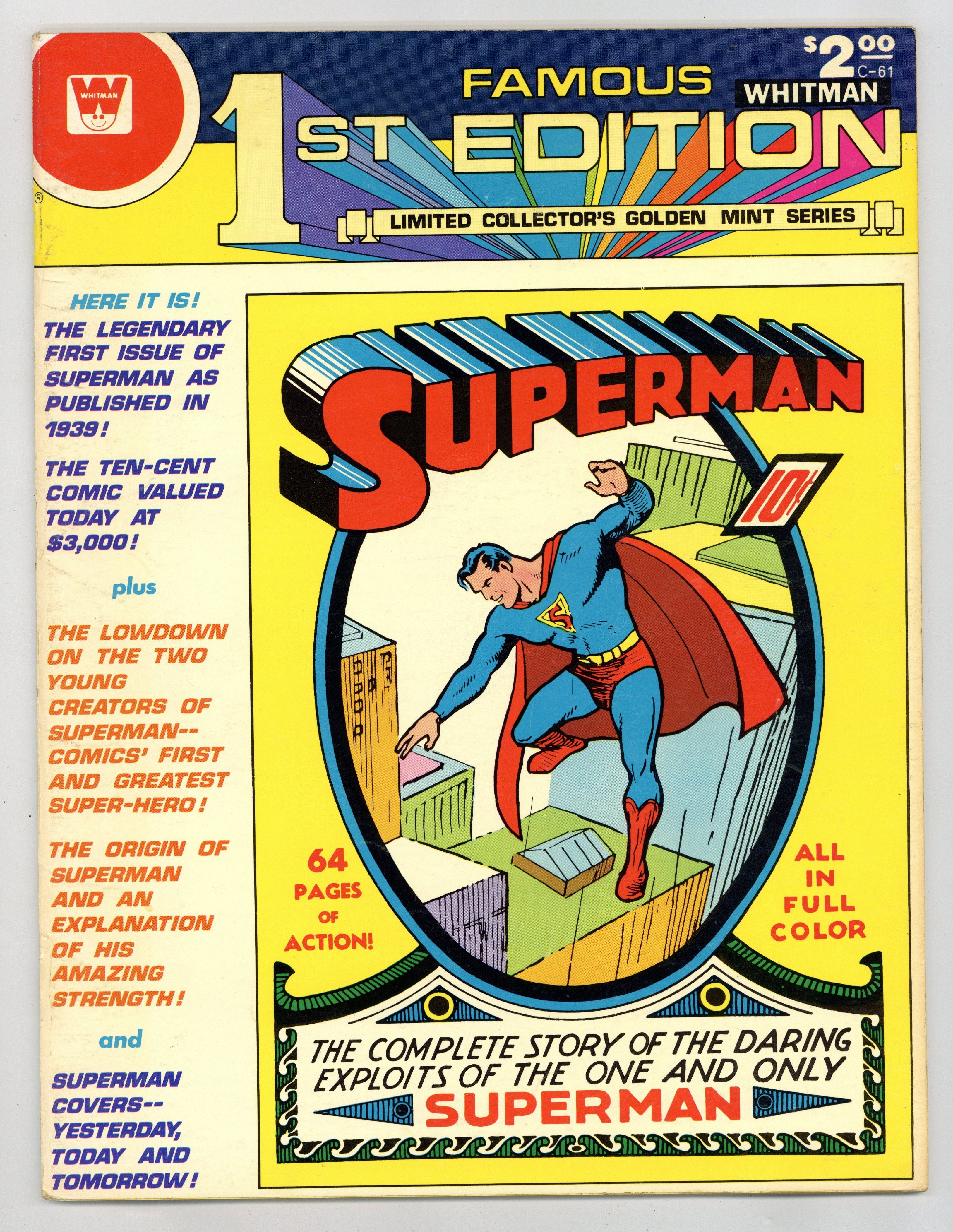 WHITMAN EDITION. Famous First Edition V8#C-61: Superman #1 NOTE: This almost exact replica edition is 10 x 13-1/2" (about the size of a Life magazine); it has two covers. The original, 1939 first edition is standard comic book size. Cover price $2.00.