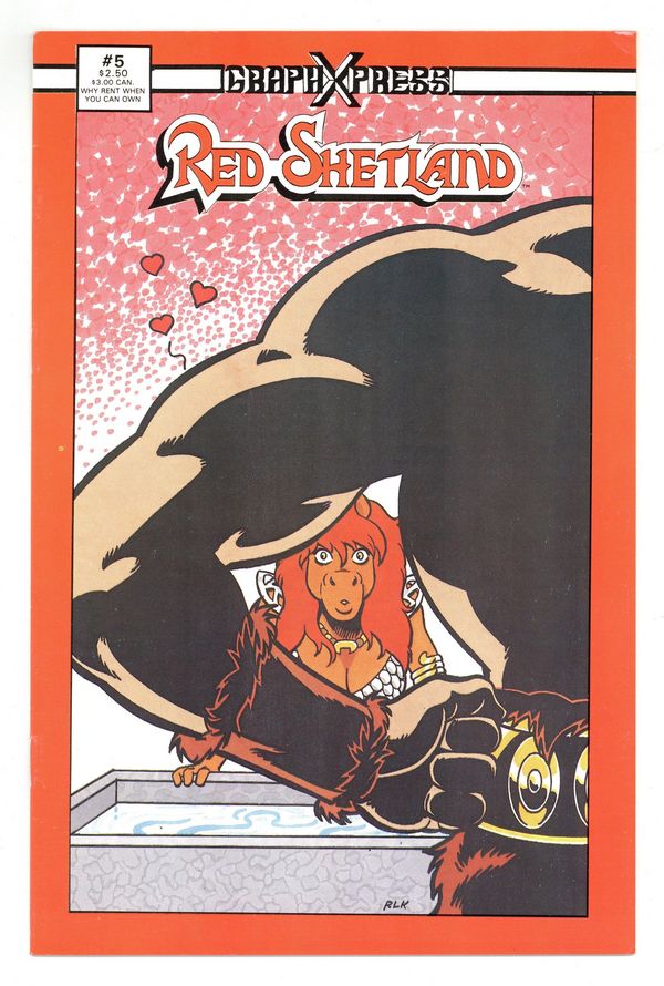 Published Jan 1992 by Graphxpress.$19.50First $2.50 cover price. Cover art by Richard Konkle. Red Shetland, script by Richard Konkle, pencils by Scott Ruggels (layouts) and Terrie Smith, inks by Dan Lopez (pgs 11-28), Scott Ruggels (pgs 1-10), Eric Elliott, and Monika Livingston (assists); Lady Mizbich hires Red as a bodyguard as they search for her missing husband, King of Pferdberg; They pause at a rest stop which they discover to be populated by Sand Dreamers which cast illusions to capture you. Back cover art by Terrie Smith. Red Sonja parody series. B&W. 32 pgs. $2.50. Cover price $2.00.