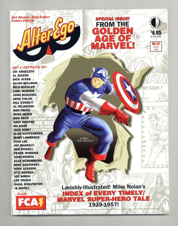 Published Mar 2006 by TwoMorrows.$11.25This issue spotlights the Golden Age of Marvel Comics! With a full-color painted Captain America cover by Jack Kirby and Pete Von Sholly, a complete issue-by-issue index of Timely/Atlas/Marvel super-hero stories, and Gene Colan and Allen Bellman on the 1940s Timely super-heroes, this issue is not to be missed. (Twomorrows Publishing) Magazine, 100pgs, B&WSRP: $6.95 Cover price $6.95.