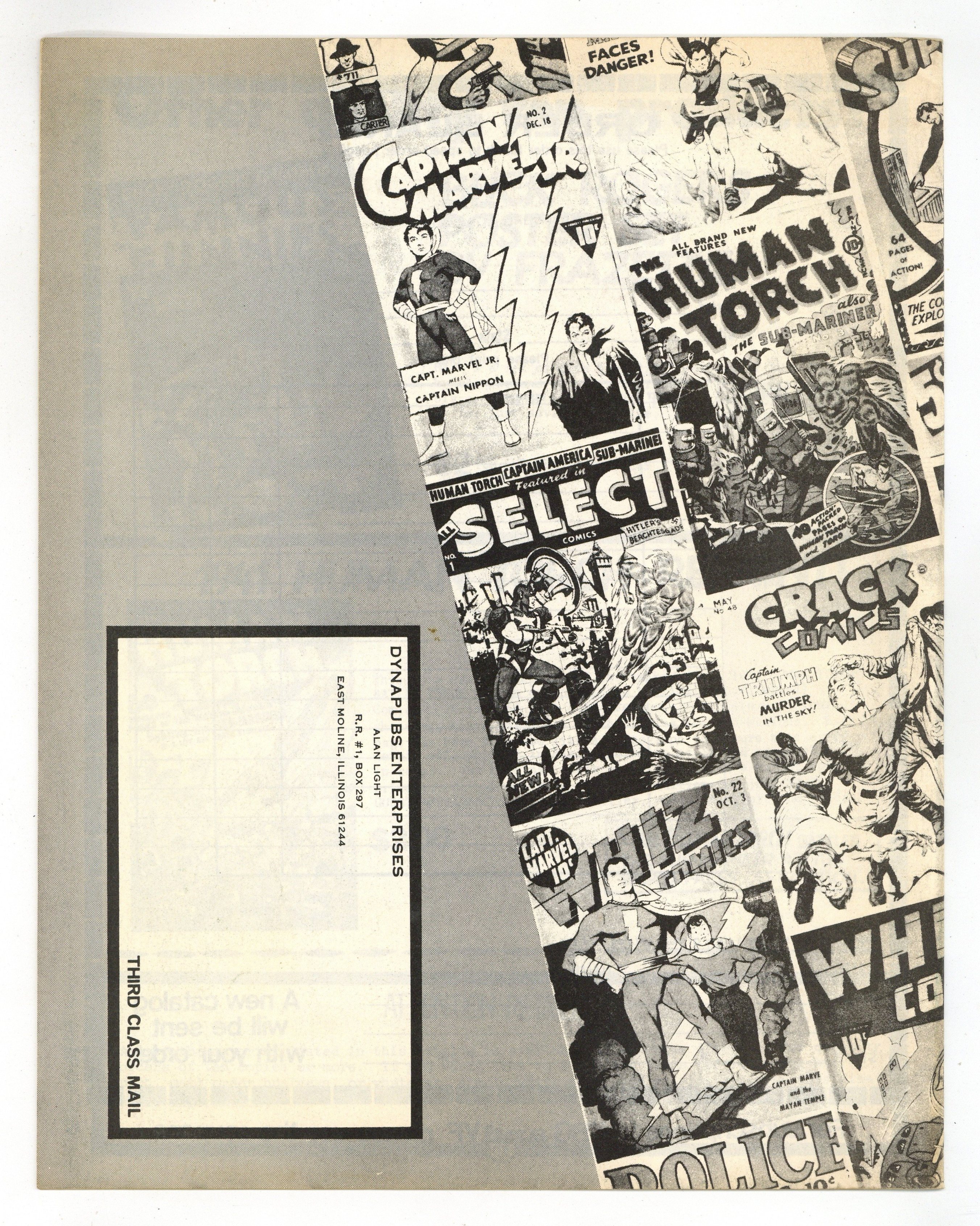 $25.00DynaPubs Catalog (1974) includes ads for The Buyer's Guide and Flashback Golden Age reprints such as Captain Marvel, Young Allies, All Star, Military, Pep, Doll Man, Daredevil Battles Hitler, Plastic Man, World's Finest, Sub-Mariner, Human Torch, Spy Smasher, Silver Streak, and Captain America. Also includes Feature Showcase reprinting comic strips starring Buck Rogers, Vintage Funnies newspapers, and Buck Rogers posters by Frank Frazetta. 16 pages, 8.5-in. x 10.5-in., black and white cover/interior.