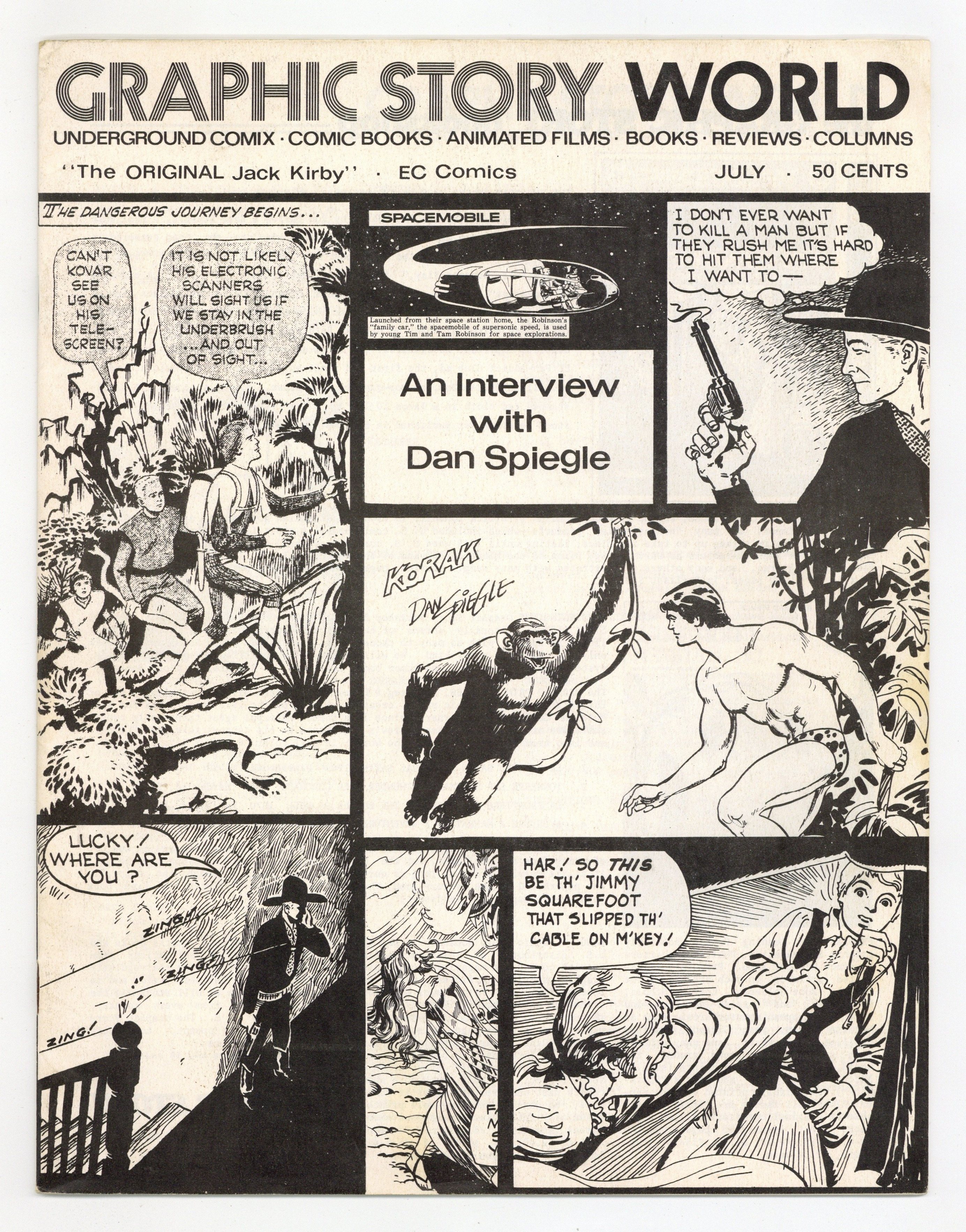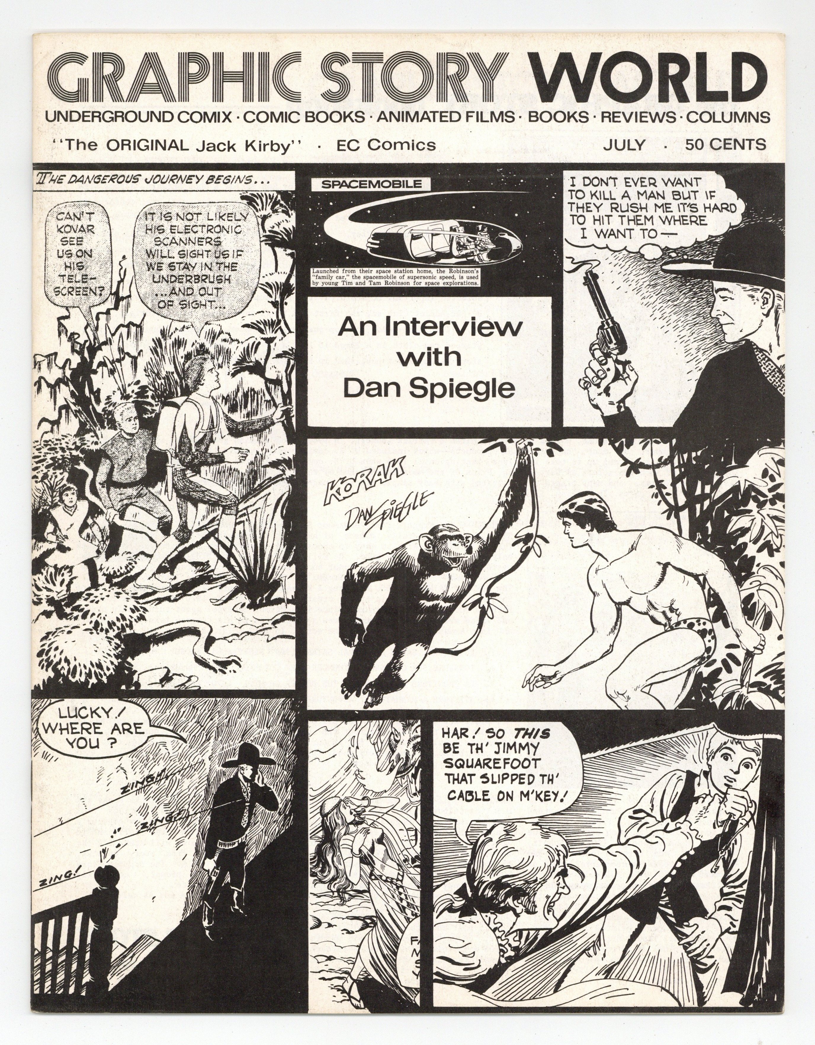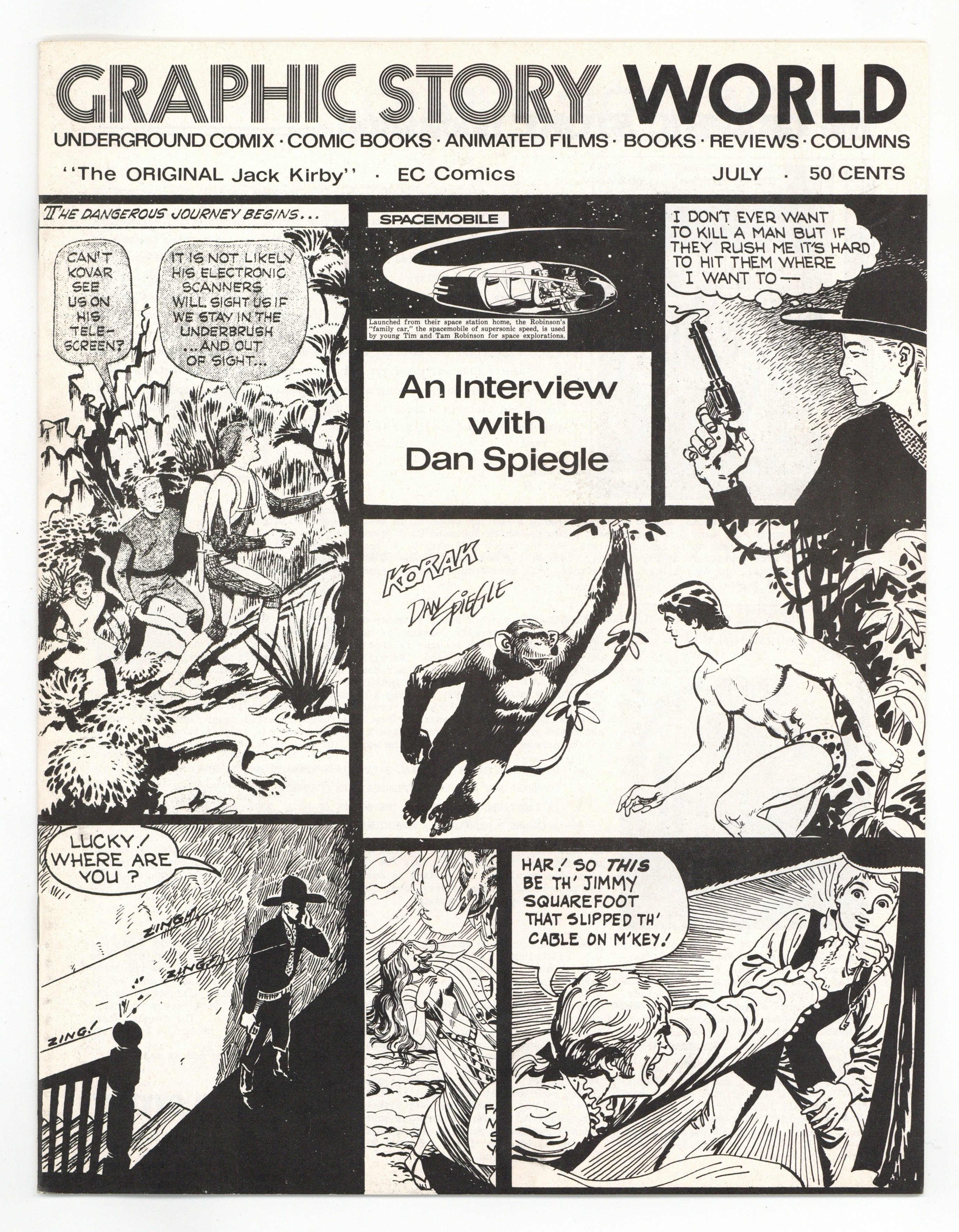 $25.00July 1972. Volume 2, Number 2, Whole Number 6. Graphic Story World is a newsletter edited by Richard Kyle covering the entire spectrum of graphic arts: Underground Comix, Comic Books, Animated Films, Books, & more. This issue: Dan Spiegle cover. An interview with Dan Spiegle, The Original Jack Kirby by Mark Evanier, in his article "Between the Panels", John Bensons asks the question - 'Are you an EC fan?', and lots more. 8 1/2-in. x 11-in.; black and white, 28 pages. Cover price $0.50.