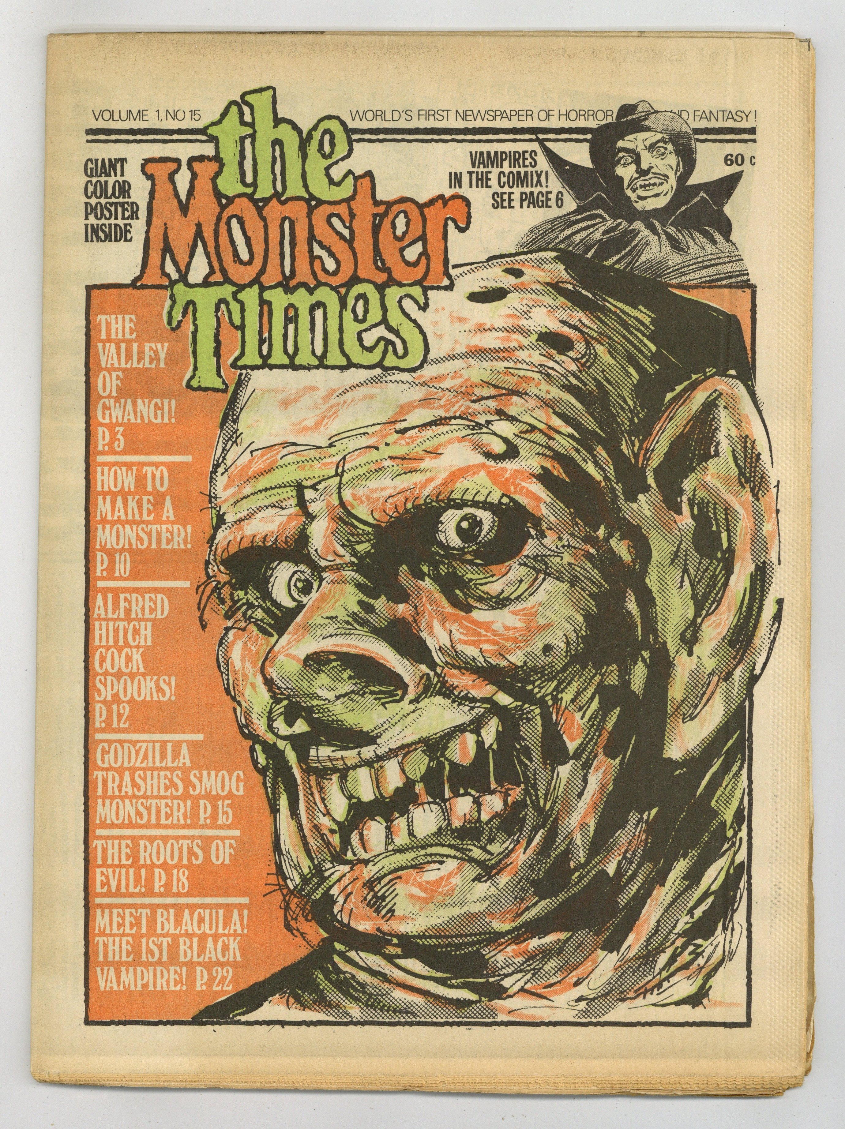 Published Oct 1972 by Monster Times Publishing.$14.25The World's First Newspaper of Horror, Sci-Fi and Fantasy! This issue: The Valley of Gwangi! Vampires in the Comix! How to Make a Monster! Alfred Hitchcock Spooks! Godzilla Trashes Smog Monster! The Roots of Evil! Meet Blacula - The 1st Black Vampire! Plus - Giant Color Poster Inside. The Monster Times (1972) is a fanzine published by Monster Times Publishing Co. 32 pages, color cover with black and white photos and illustrations, 12-in x 14-in Cover price $0.50.