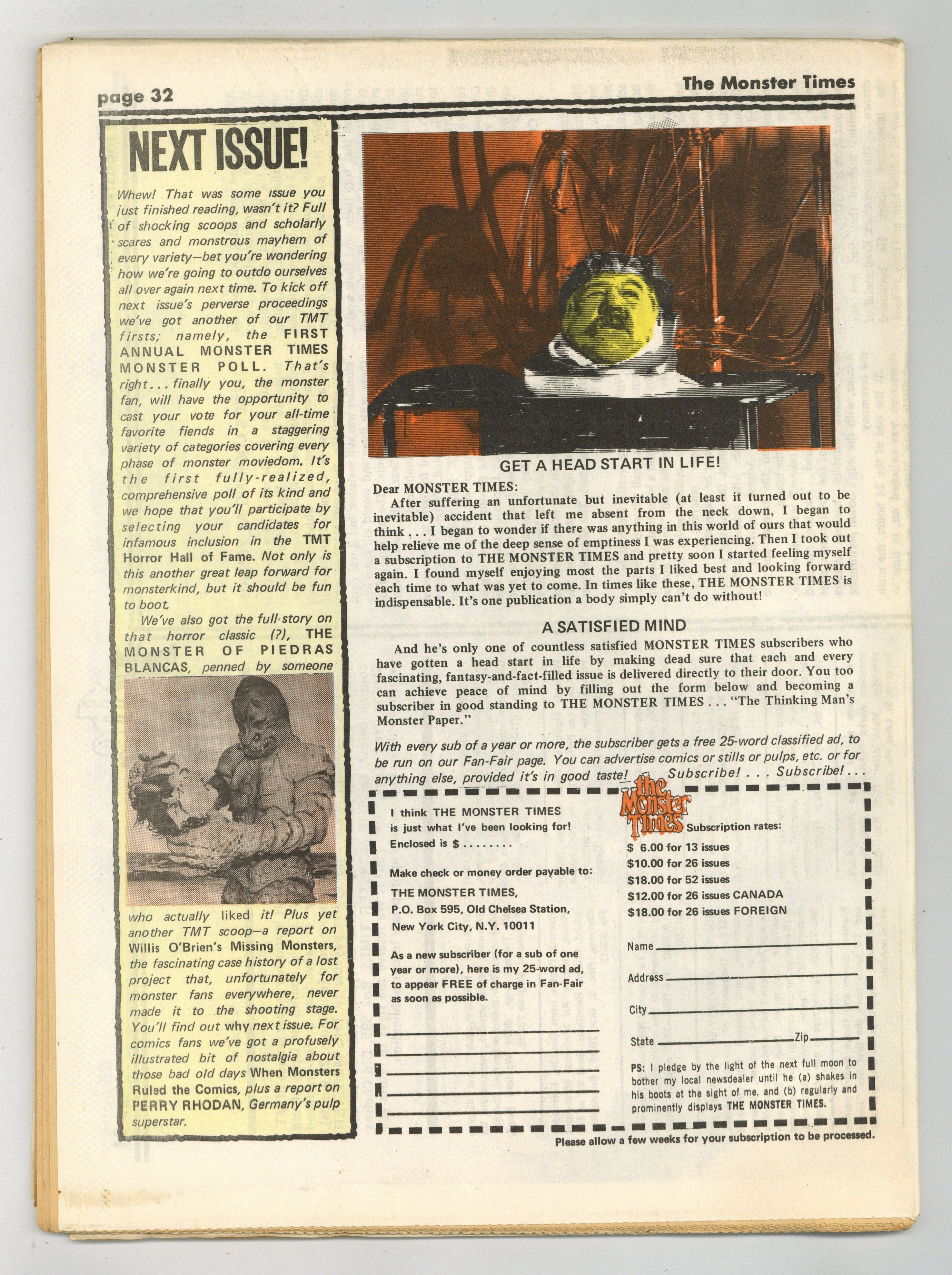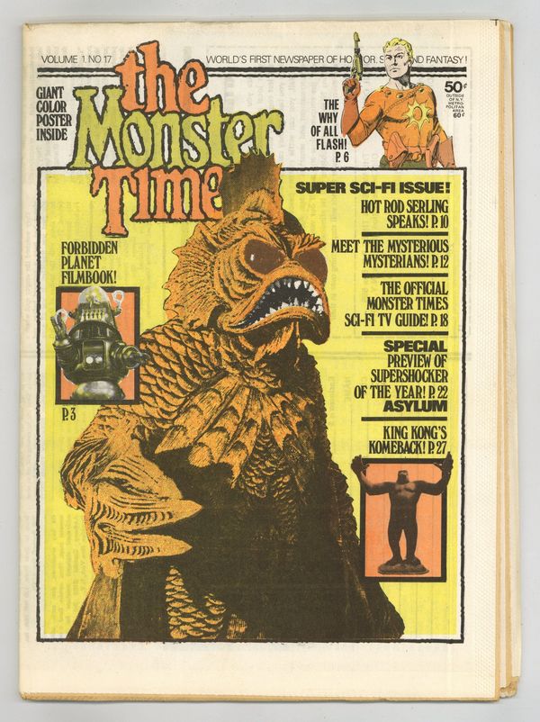 Published Nov 1972 by Monster Times Publishing.$32.00Issue #17. November 30, 1972. The World's First Newspaper of Horror, Sci-Fi and Fantasy! Super Sci-Fi Issue! Featuring: Hot Rod Serling Speaks! Forbidden Planet Filmbook! The Why of All Flash! Meet the Mysterious Mysterians! The Official Monster Times Sci-Fi TV Guide! Special Preview of Supershocker of the Year - Asylum! King Kong's Komeback! Plus - Giant Color Poster Inside. 11.25" x 16.25". 32 pages. Black and white. Cover price $0.50.