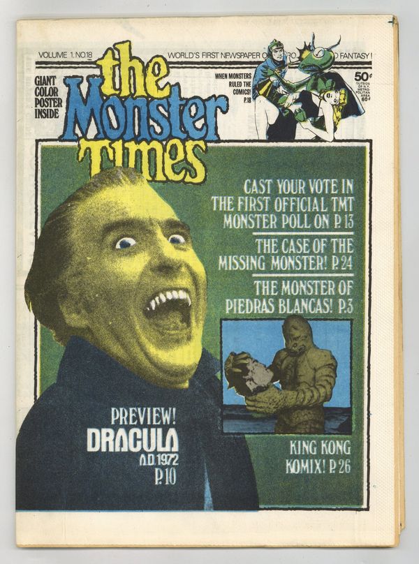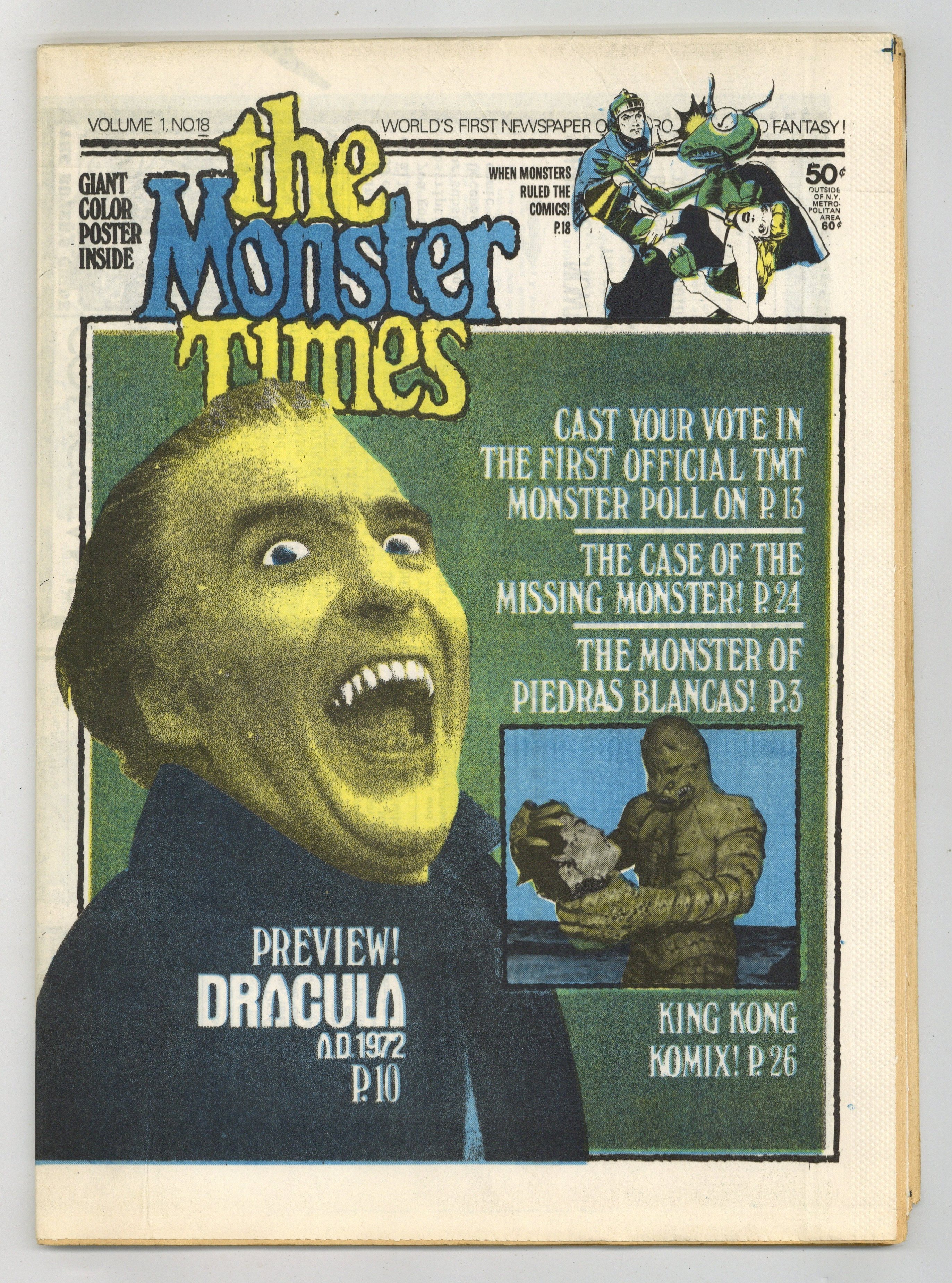 Published Dec 1972 by Monster Times Publishing.$22.00Issue #18. December 31, 1972. The World's First Newspaper of Horror, Sci-Fi and Fantasy! This issue: Preview - Dracula A.D. 1972! King Kong Komix! When Monsters Ruled the Comics! Cast Your Vote in the First Official TMT Monster Poll! The Case of the Missing Monster! The Monster of Piedras Blancas! Plus - Giant Color Poster Inside. Cover price $0.50.