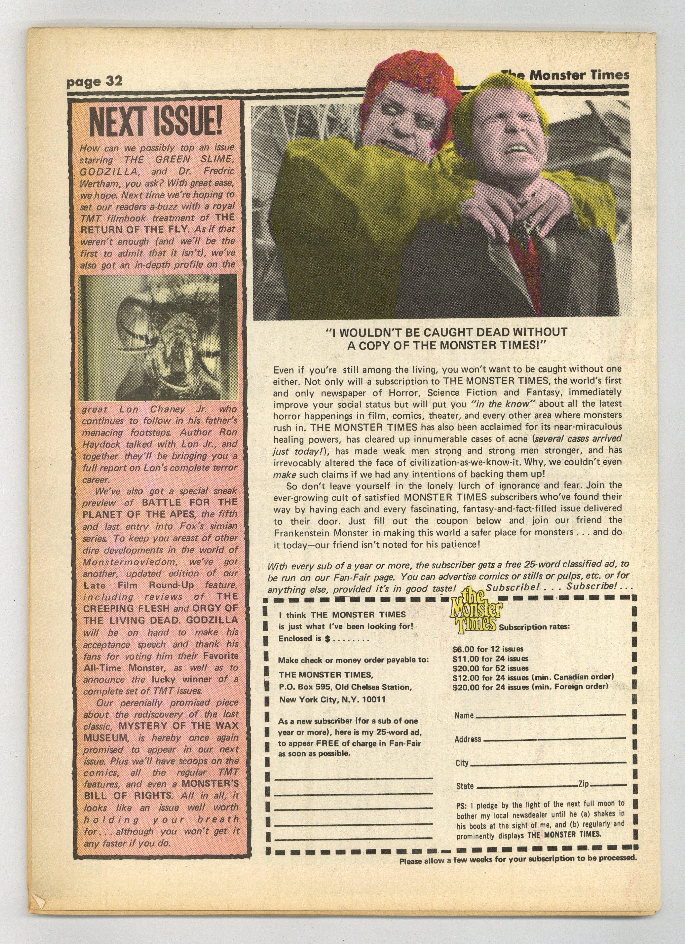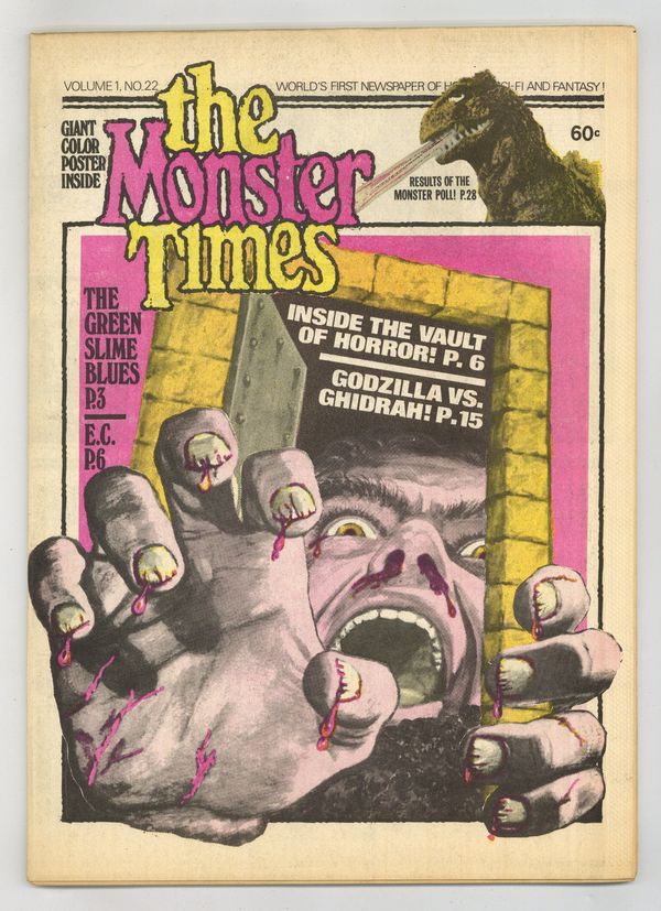 Published May 1973 by Monster Times Publishing.$32.00Issue #22. May 1973. The World's First Newspaper of Horror, Sci-Fi and Fantasy! This issue: Inside the Vault of Horror! Godzilla vs. Ghidrah! Results of the Monster Poll! The Green Slime Blues! E.C.! Plus - Giant Color Poster Inside. The Monster Times (1972) is a fanzine published by Monster Times Publishing Co. 32 pages, color cover with black and white photos and illustrations, 12-in x 14-in. Cover price $0.50.