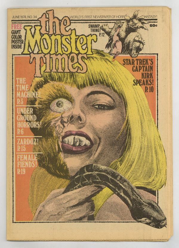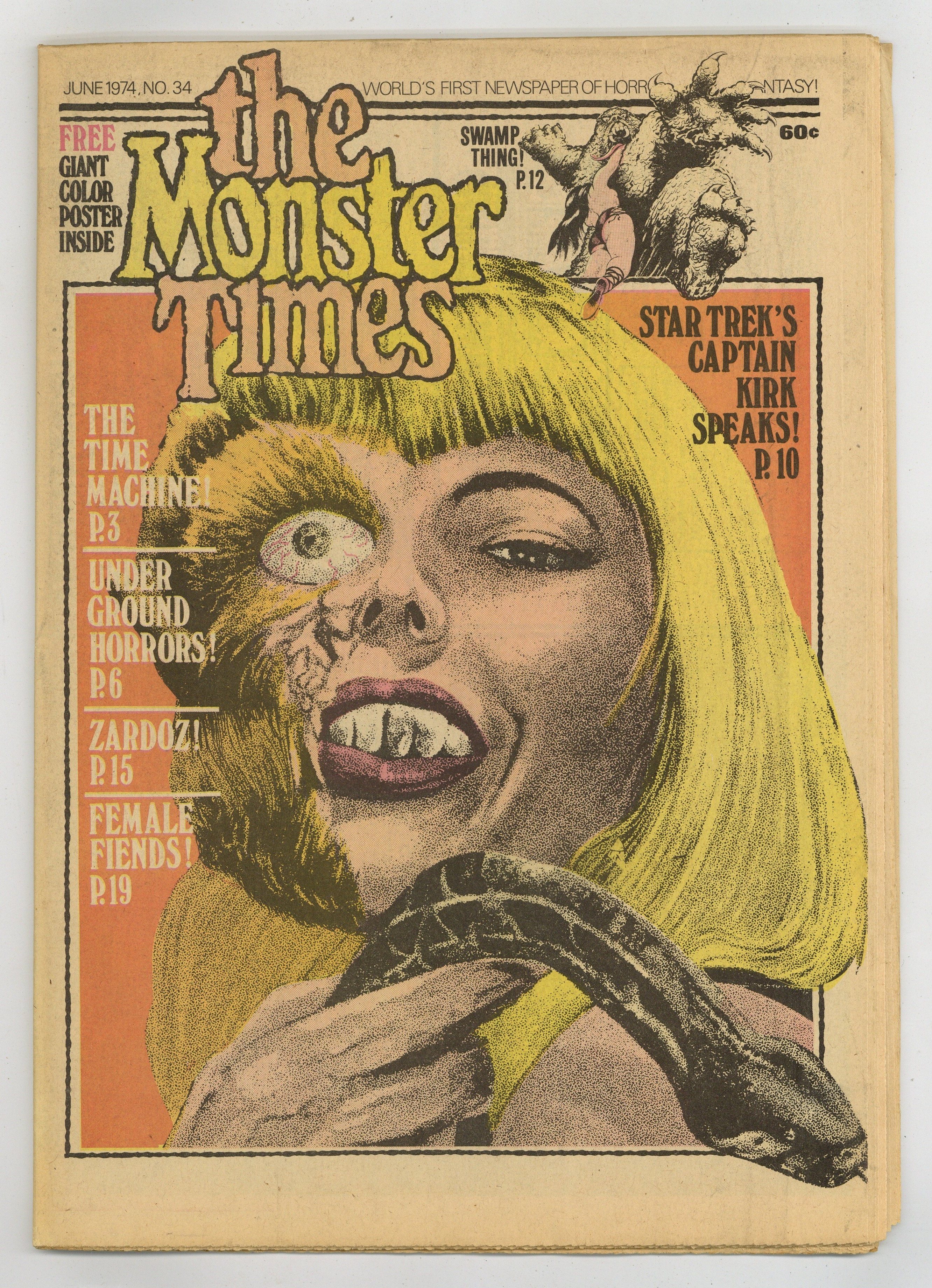 Published Jun 1974 by Monster Times Publishing.$24.00The World's First Newspaper of Horror, Sci-Fi and Fantasy! This issue: Star Trek's Captain Kirk Speaks! The Time Machine! Swamp Thing! Under Ground Horrors! Zardoz! Female Fiends! Plus - Free Giant Color Poster Inside. Cover price $0.60.