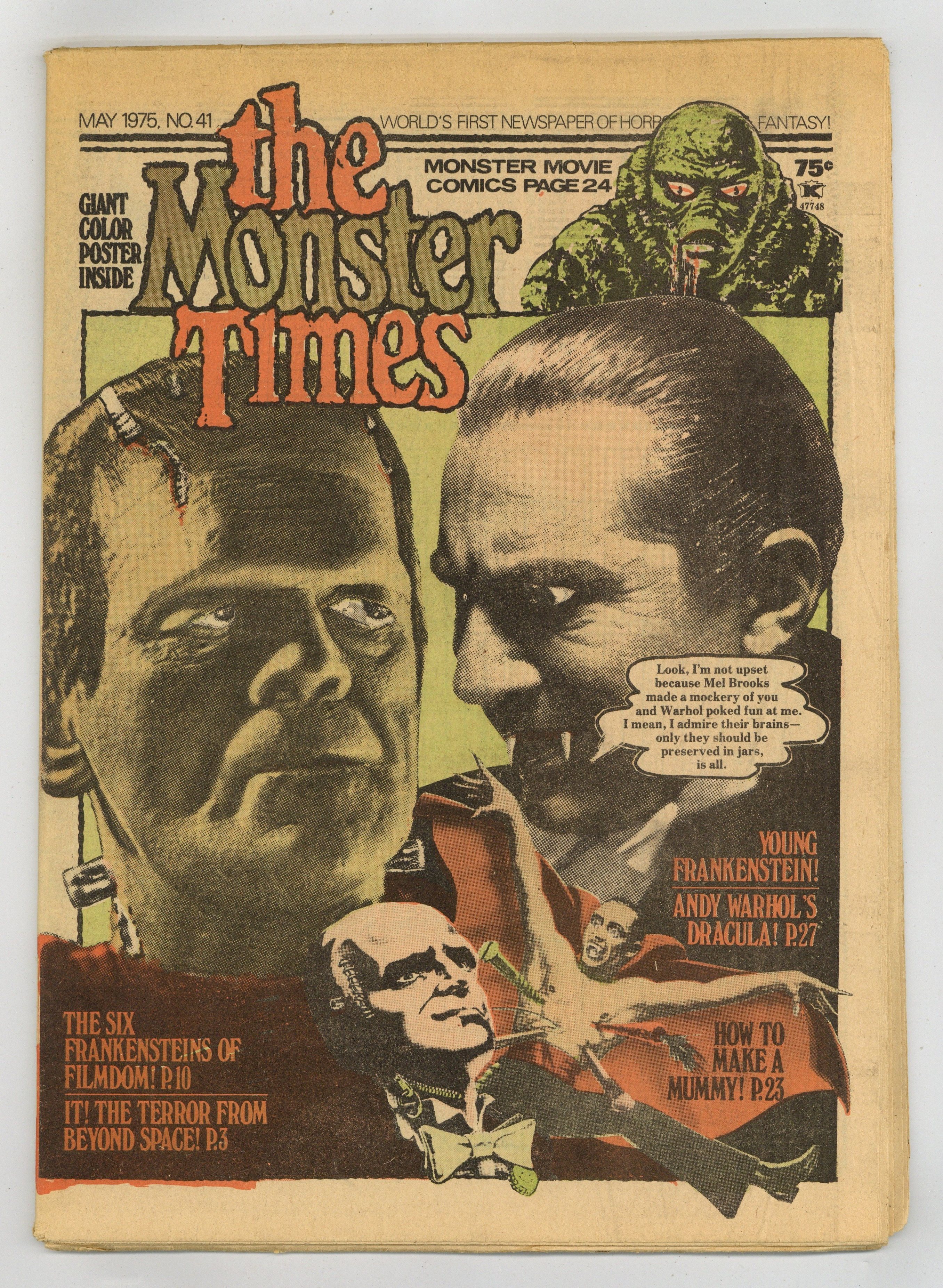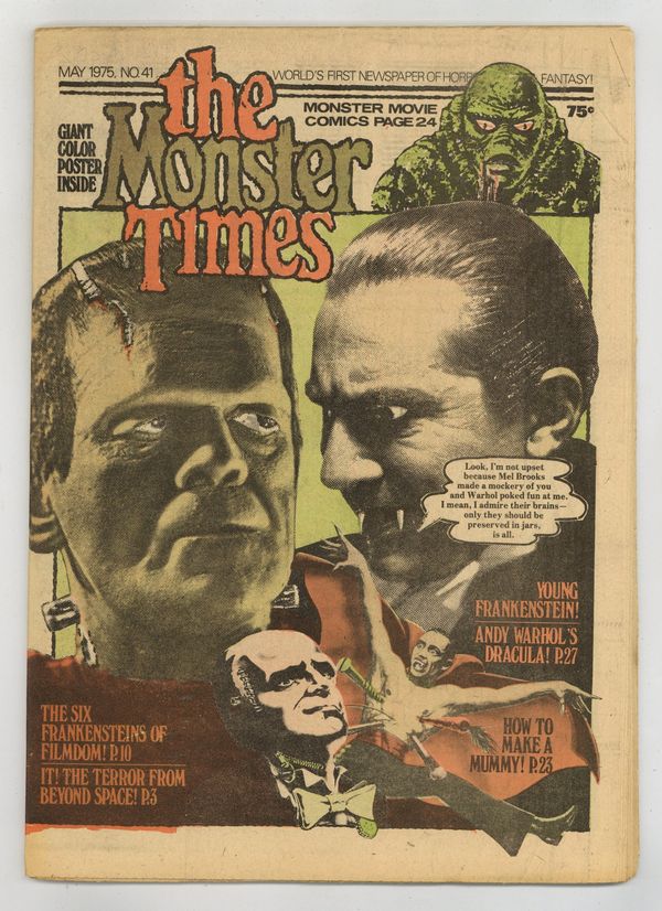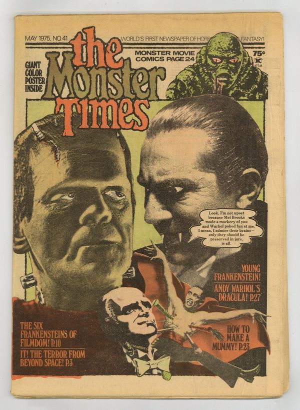 Published May 1975 by Monster Times Publishing.$20.00The World's First Newspaper of Horror, Sci-Fi and Fantasy! This issue: The Six Frankensteins of Filmdom! It! The Terror from Beyond Space! Monster Movie Comics! Young Frankenstein! Andy Warhol's Dracula! How to Make a Mummy! Plus - Giant Color Poster Inside. Cover price $0.75.