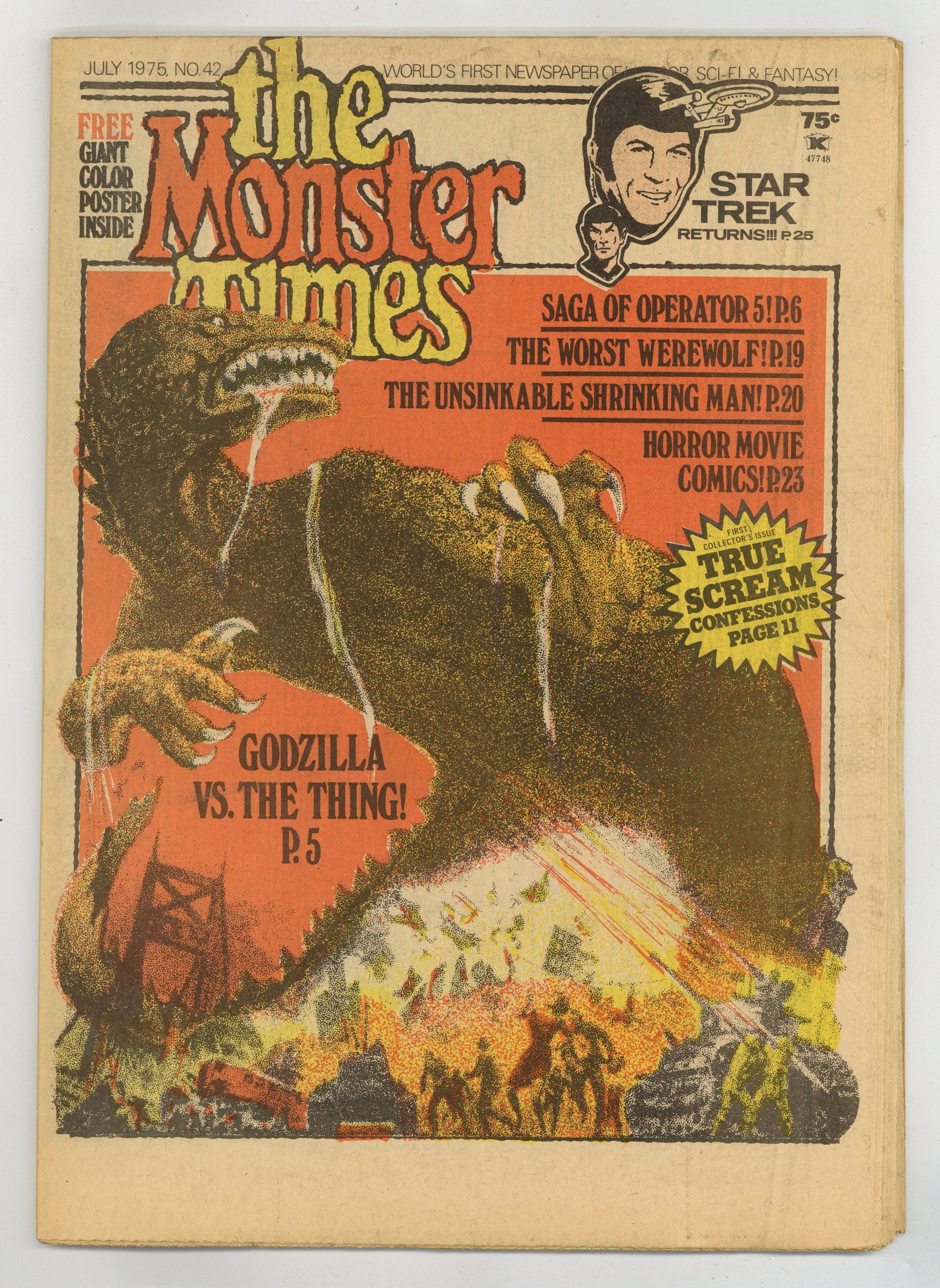Published Jul 1975 by Monster Times Publishing.$24.00The World's First Newspaper of Horror, Sci-Fi and Fantasy! This issue: Godzilla vs. the Thing! True Scream Confessions! Star Trek Returns! Saga of Operator 5! The Worst Werewolf! The Unsinkable Shrinking Man! Horror Movie Comics! Plus - Free Giant Color Poster Inside. Cover price $0.75.