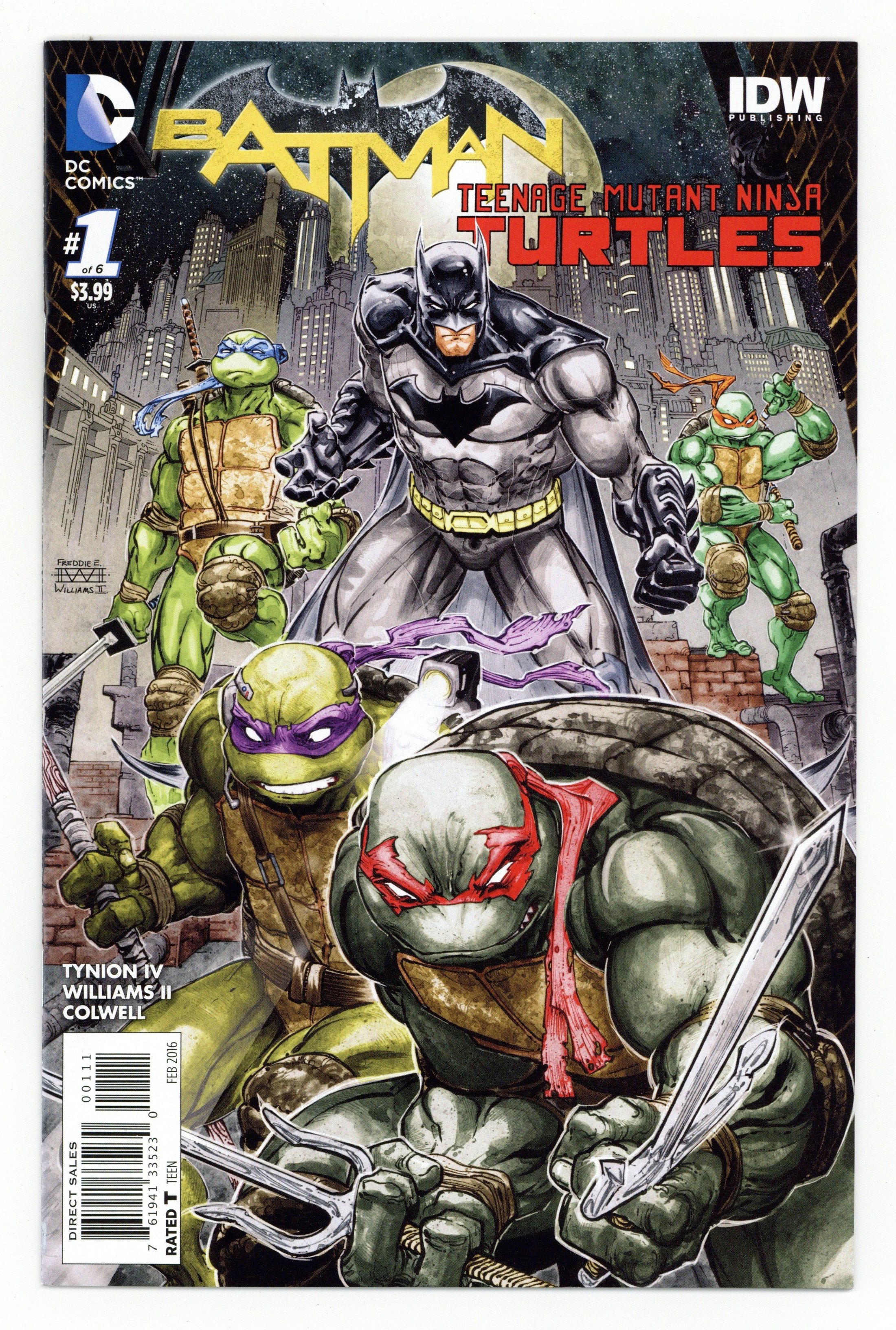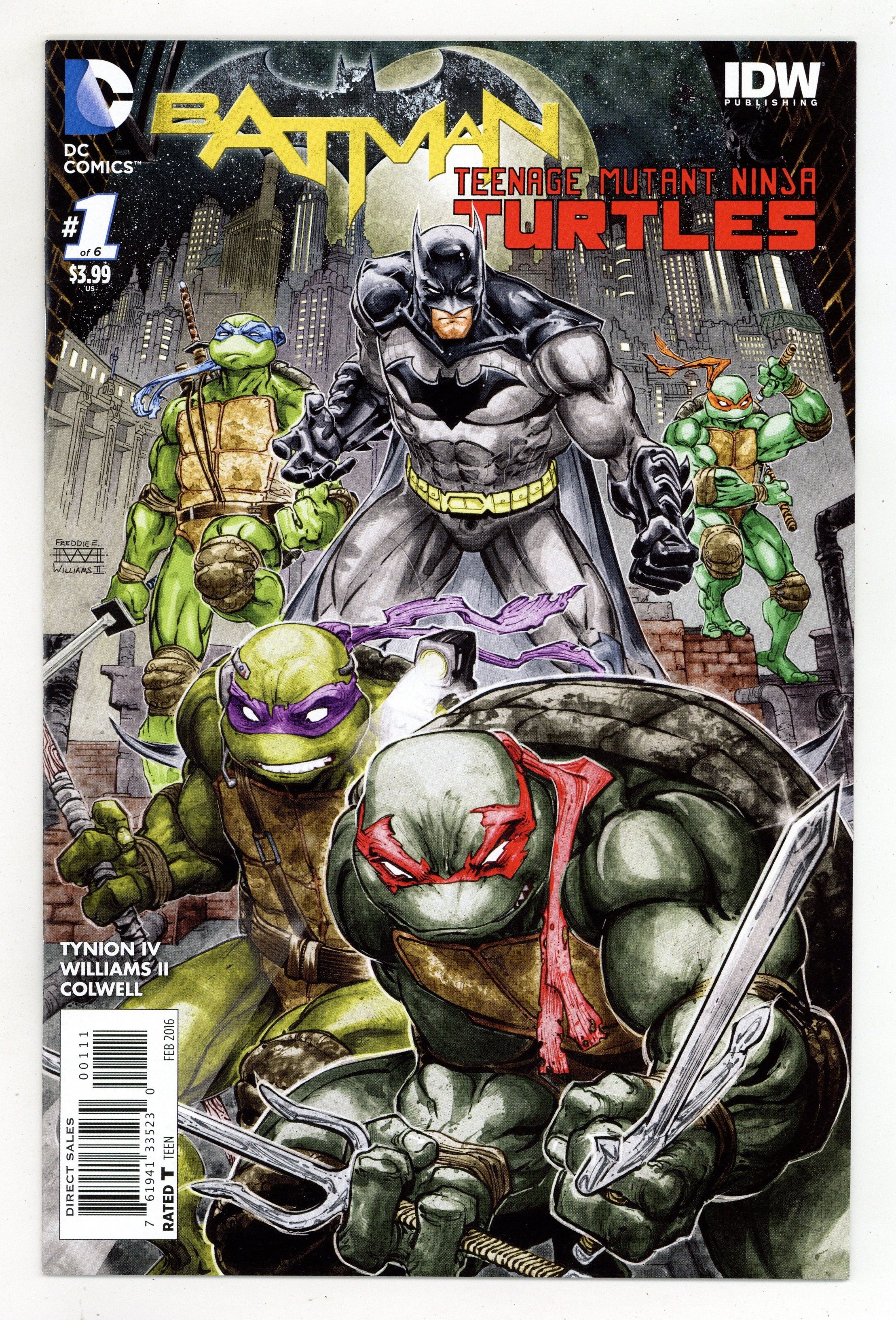 Written by James Tynion IV. Art and Cover by Freddie Williams II. DC Comics and IDW team up for the crossover you never saw coming as two of the greatest entertainment icons meet for the first time! In Gotham City, a series of deadly raids leads Batman to believe he's up against a group of highly trained ninjas known as the Foot Clan! Somehow, they've crossed over to another dimension and are determined to take advantage of the situation while looking to get back home. But they haven't come alone: Leonardo, Raphael, Donatello and Michelangelo are hot on their trail. Get ready for excitement as heroes and villains from both worlds clash and team up in an epic battle that threatens the very fabric of reality! 32 pages, full color. Rated T Cover price $3.99.