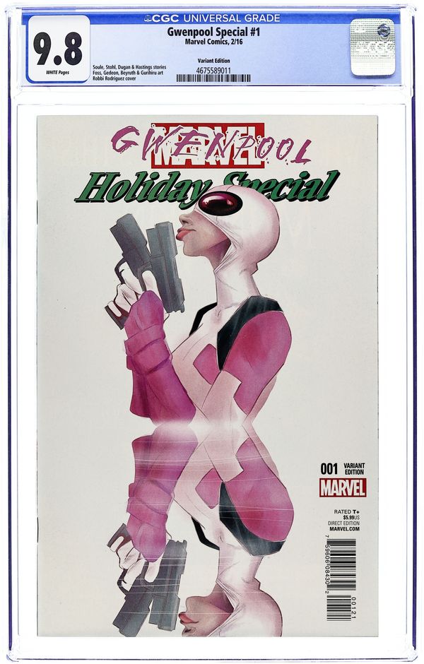 Gwenpool Variant Cover by Robbi Rodriquez. Written by Charles Soule, Margaret Stohl, Gerry Dugan and Christopher Hastings. Art by Langdon Foss, Juan Gedeon, Danilo S. Beyruth and Gurihiru. AN ALL-NEW, ALL-DIFFERENT MARVEL HOLIDAY SPECIAL! She-Hulk throws a holiday party and invites the entire Marvel U! Deadpool teams up with both Hawkeyes - Kate and Clint - to…stop a pickpocket?! Ms. Marvel takes on her most dangerous threat yet: the holiday blues! And then there's the reason for the season(al special): GWENPOOL! Yup, you read that right - Gwen. Pool. C'mon, you know you're curious. 60 pages, full color. Rated T+ Cover price $5.99.
