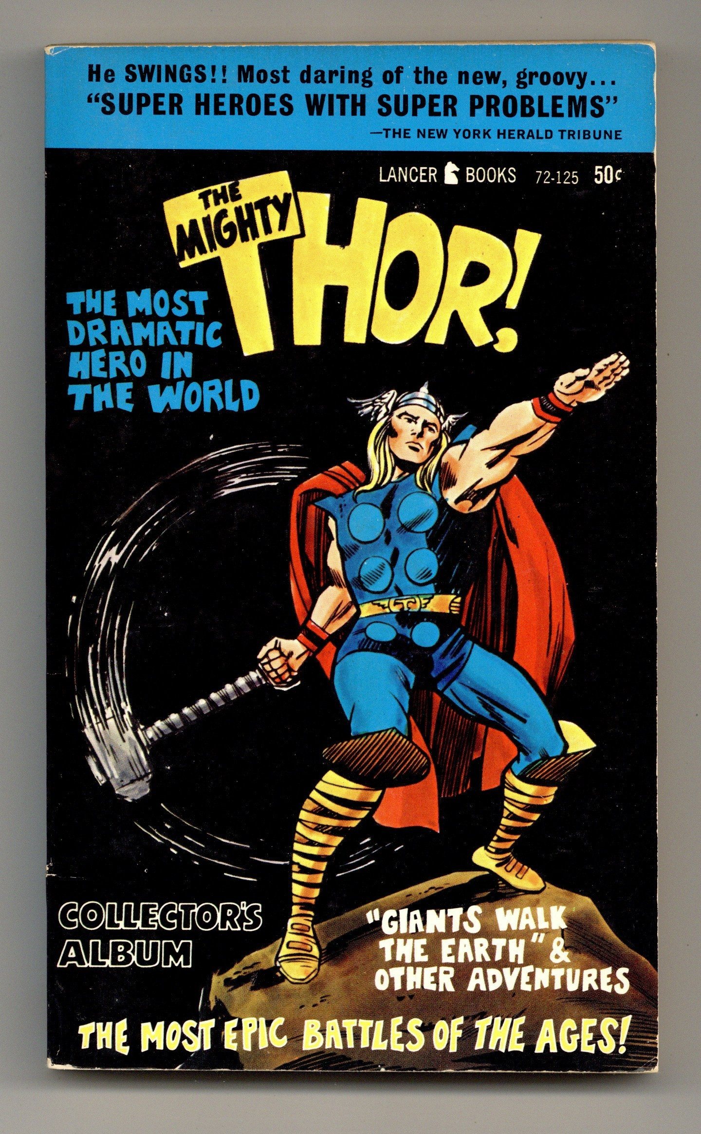 Tags: Lancer Books Collector's Album (part 5)Published 1966 by Marvel/Lancer.$23.001st printing. Collects Thor (1962-1996 1st Series) #97, 104, and 114-115. Written by Stan Lee. Art by Jack Kirby. From the pages of Journey into Mystery comes the epic tale "Giants Walk the Earth!" and other classic Odinson adventures. Featuring the villainy of the always dangerous Absorboing Man and the diabolical Loki. Softcover, 4-in. x 7-in., 172 pages, B&W. Cover price $0.50.
