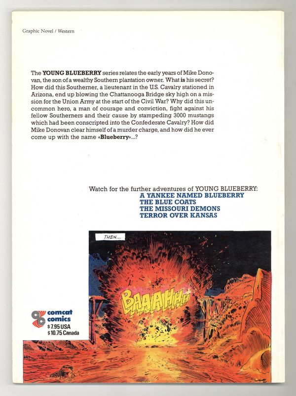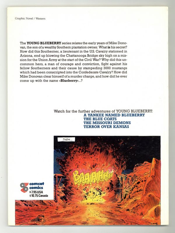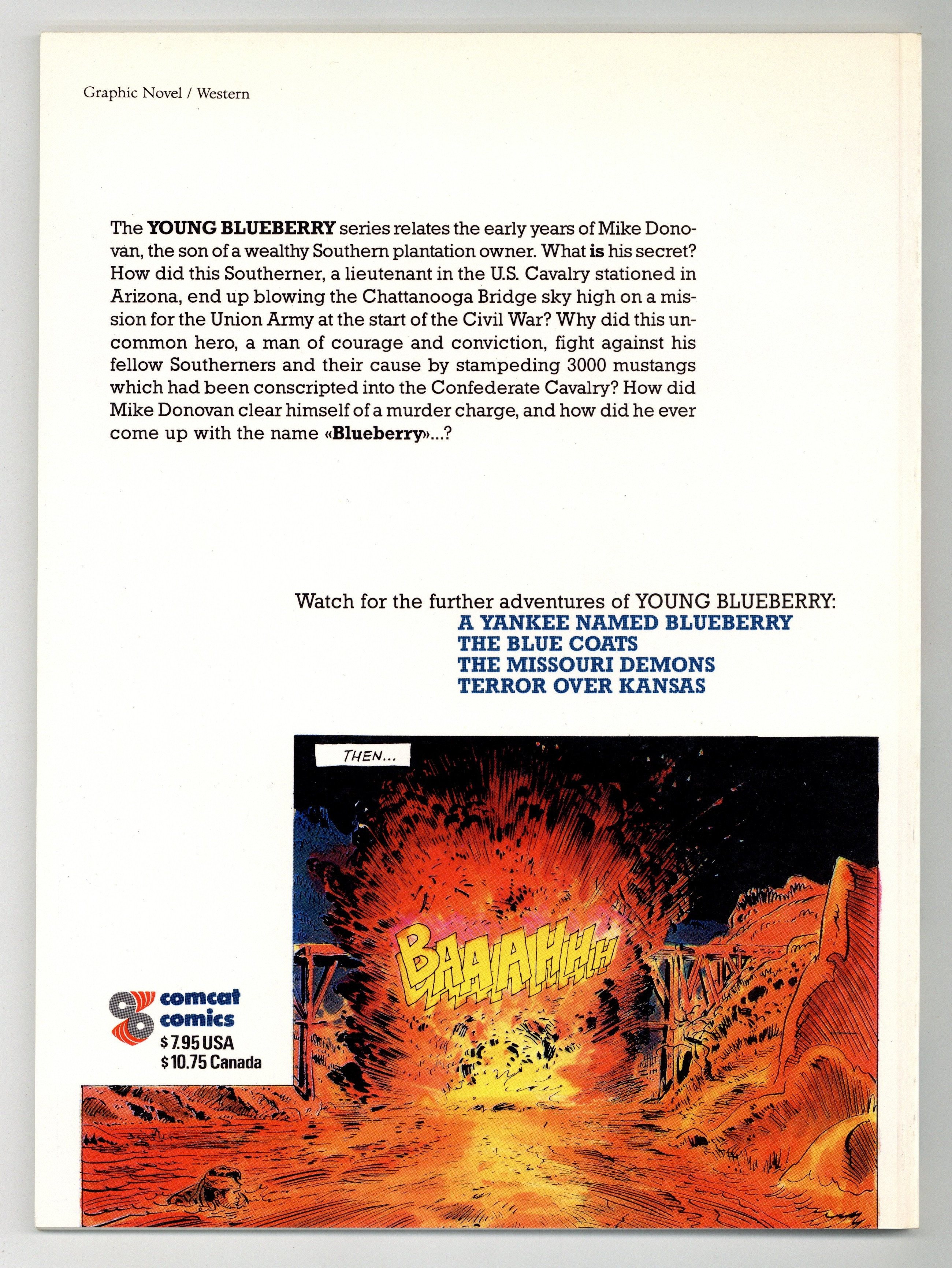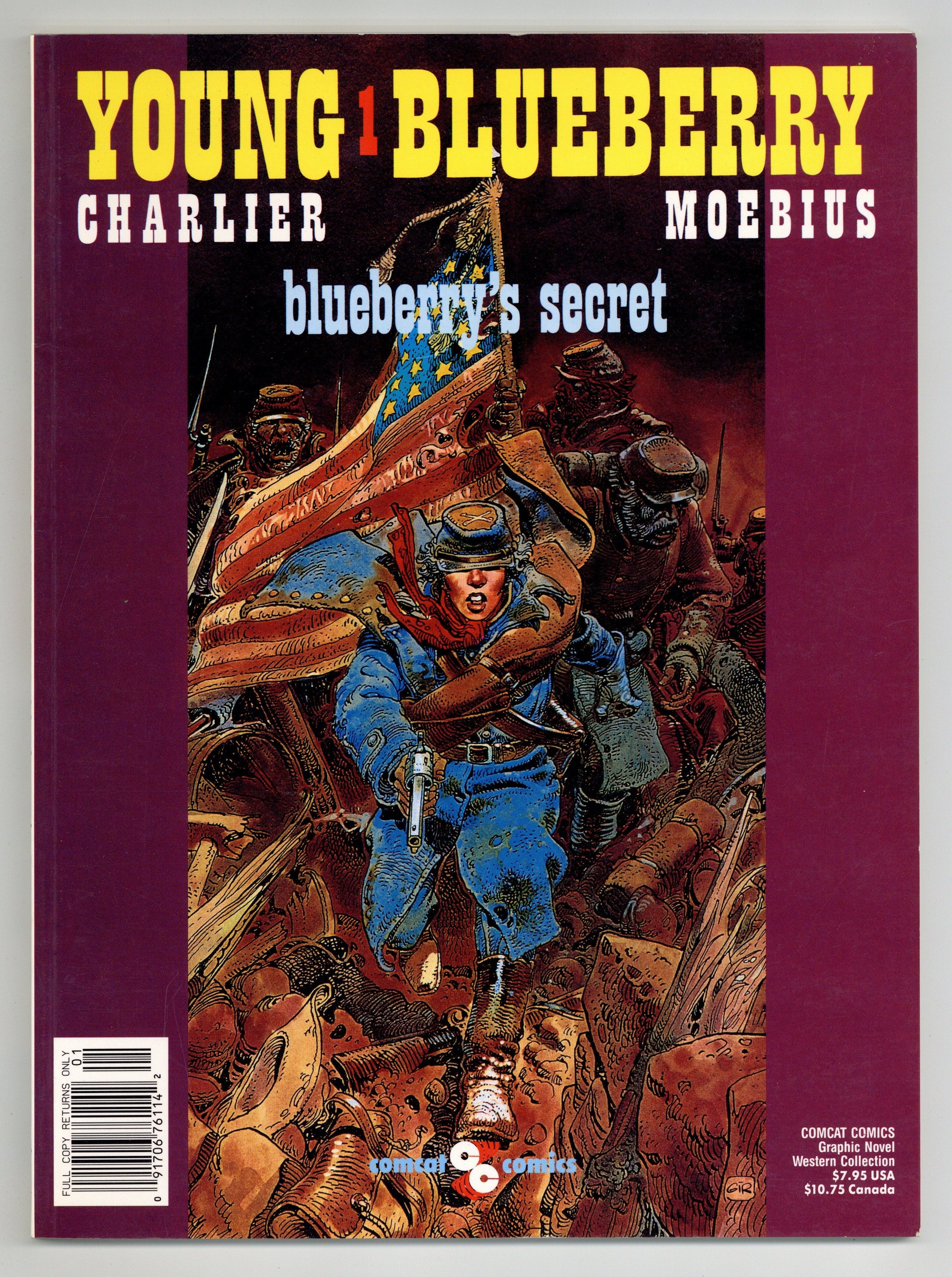 Published Oct 1989 by Comcat Comics.$33.00Volume 1 - 1st printing. "Blueberry's Secret!" Written by Jean-Michel Charlier . Art by Jean "Moebius" Giraud. This graphic novel tells the story of the early years of Mike Donovan a lieutenant in the US Calvary. Learn how he came to blow the Cattanooga Bridge sky high at the start of the Civil War, and how he cleared himself of murder charges. Plus, where did this western hero ever get the name "Blueberry?" Softcover, 8-in. x 11-in., 56 pages, full color. Cover price $7.95.