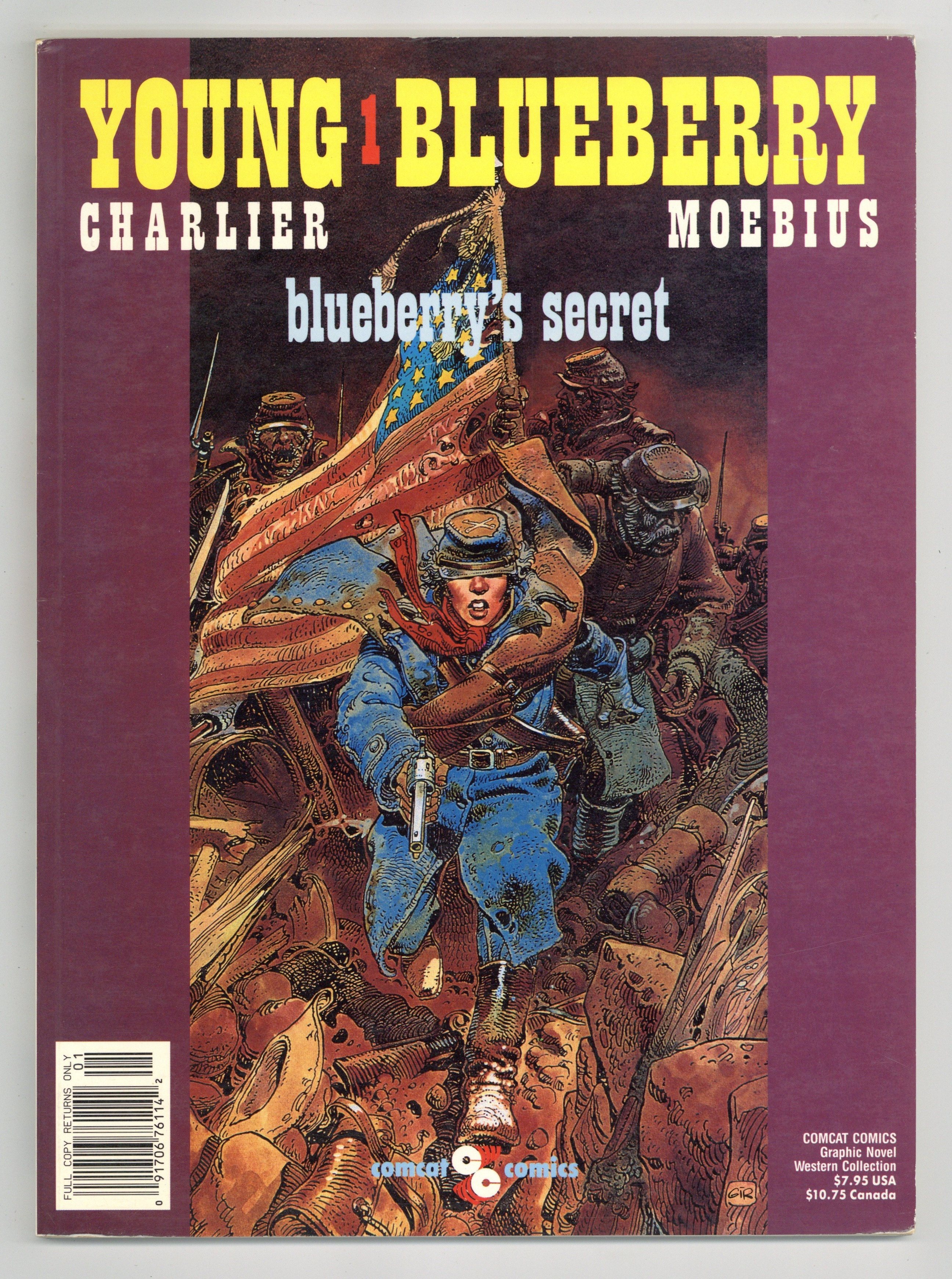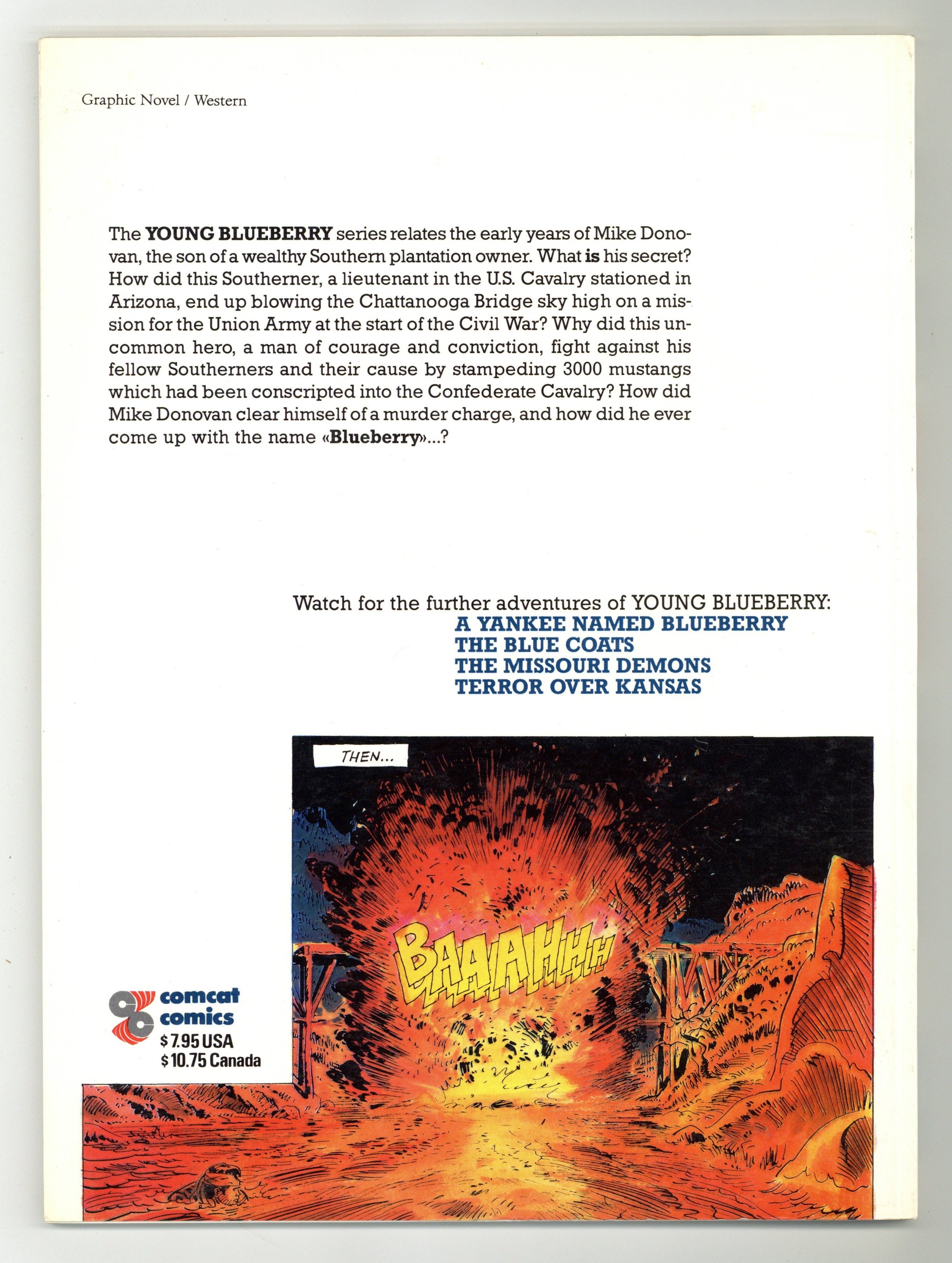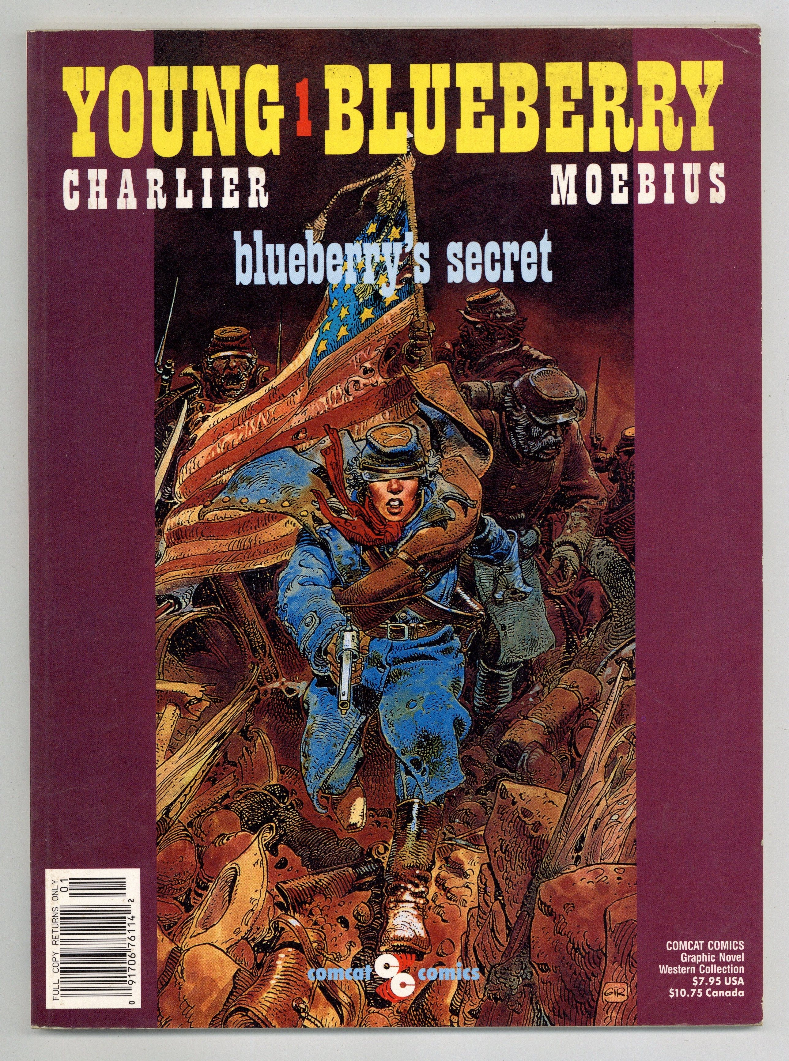 Published Oct 1989 by Comcat Comics.$25.00Volume 1 - 1st printing. "Blueberry's Secret!" Written by Jean-Michel Charlier . Art by Jean "Moebius" Giraud. This graphic novel tells the story of the early years of Mike Donovan a lieutenant in the US Calvary. Learn how he came to blow the Cattanooga Bridge sky high at the start of the Civil War, and how he cleared himself of murder charges. Plus, where did this western hero ever get the name "Blueberry?" Softcover, 8-in. x 11-in., 56 pages, full color. Cover price $7.95.