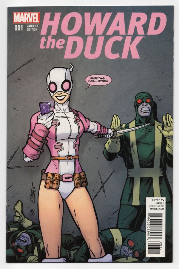 $220.00Gwenpool Variant Cover by Ron Lim. Written by Chip Zdarsky. Art by Joe Quinones. First spectacular issue! A great jumping on point! Sure to go up in value! Don't miss out on the series everyone is calling 'Howard the Duck'! The last page will shock you! Nothing will EVER be the same again! Hey! Where are you going? Come back! Waugh! 36 pages, full color. Rated T+ Cover price $4.99.