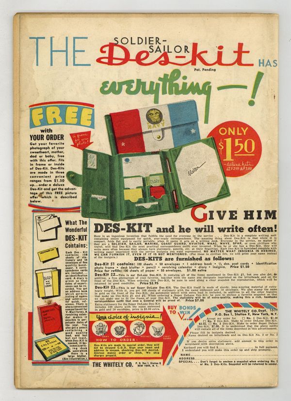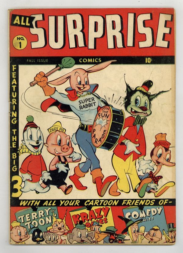 Published Sep 1943 by Timely/Marvel.$270.00Stories by unknown. Art by unknown. America's greatest comic characters! Featuring: untitled Gandy and Sourpuss story; untitled Silly Seal and Ziggy Pig story; untitled Super Rabbit story; untitled Tommy Cat story; untitled Widjit Witch and Her Broom, 'Diogenes' story; untitled The Three Rabbiteers story; and Toughy Tomcat & Chester Chipmunk in "Bank Robber Billy"! 56 pages, full color. Cover price $0.10.