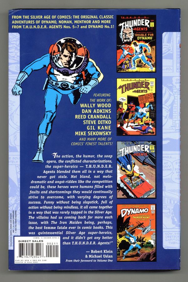 Volume 2 - 1st printing. Collects T.H.U.N.D.E.R. Agents (1965-1969) #5-7 and Dynamo (1966) #1. Written by WALLY WOOD, and STEVE SKEATES. Art by WOOD, STEVE DITKO, REED CRANDALL, MIKE SEKOWSKY, GEORGE TUSKA, BILL PEARSON, and DAN ADKINS. Cover by WALLY WOOD. The T.H.U.N.D.E.R. Agents - the secret team of super-technology-powered policemen - return in a second Archives volume, with a new introduction by film producer Michael Uslan & noted comics historian Robert Klein! Hardcover, 224 pages, full color. Cover price $49.95.