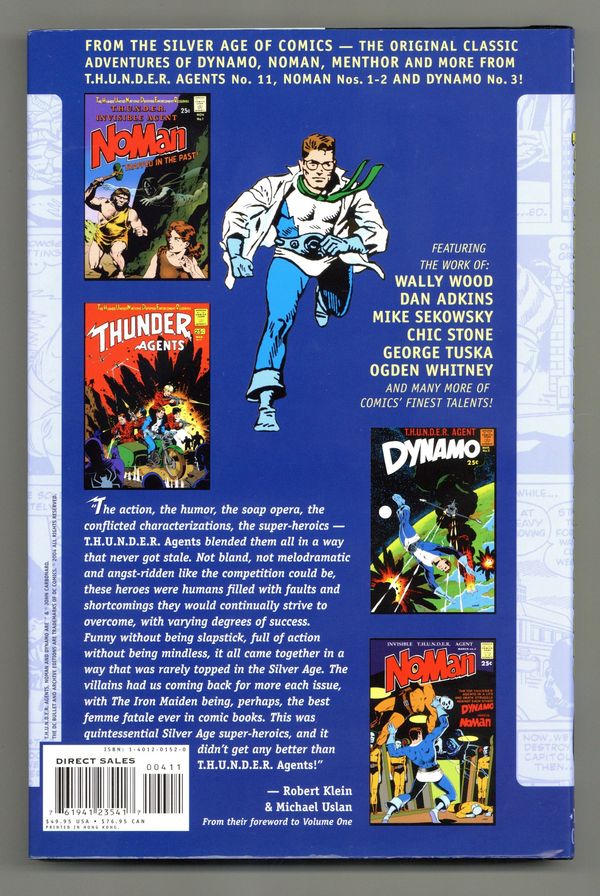 Volume 4 - 1st printing. Collects T.H.U.N.D.E.R. Agents (1965-1969) #11, Noman (1966) #1-2, and Dynamo (1966) #3. Written by WALLY WOOD and STEVE SKEATES. Art by WALLY WOOD, DAN ADKINS, MIKE SEKOWSKY, GIL KANE, MANNY STALLMAN, CHIC STONE, and OGDEN WHITNEY. Cover by WALLY WOOD. More classic 1960s adventures can be found in this Archive Edition! NoMan faces an Egyptian succubus, S.P.I.D.E.R. assassins, time-traveling aliens, the Last Subterranean and more! Plus, an introduction by Wally Wood biographer Bhob Stewart! Hardcover, 216 pages, full color. Cover price $49.95.