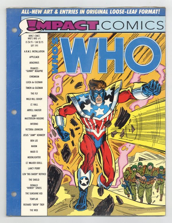 Tags: DC Index (part IM1), Comic History$8.00Volume 1 - "A.R.M.S. Installation - The Web!" - The Shield Cover - Who's Who provides complete dossiers on your favorite Impact heroes, villains, supporting casts, places and vehicles. Featuring Character listings for: A.R.M.S. Installation, Applejack, Arachnus, Frances "Gunny" Beaupre, Chromium, The Shield, The Web and more! Softcover (loose-leaf pages Made for 3-ring binders), 8 1/2 x 11, 48 pages, full color. Cover price $4.95.