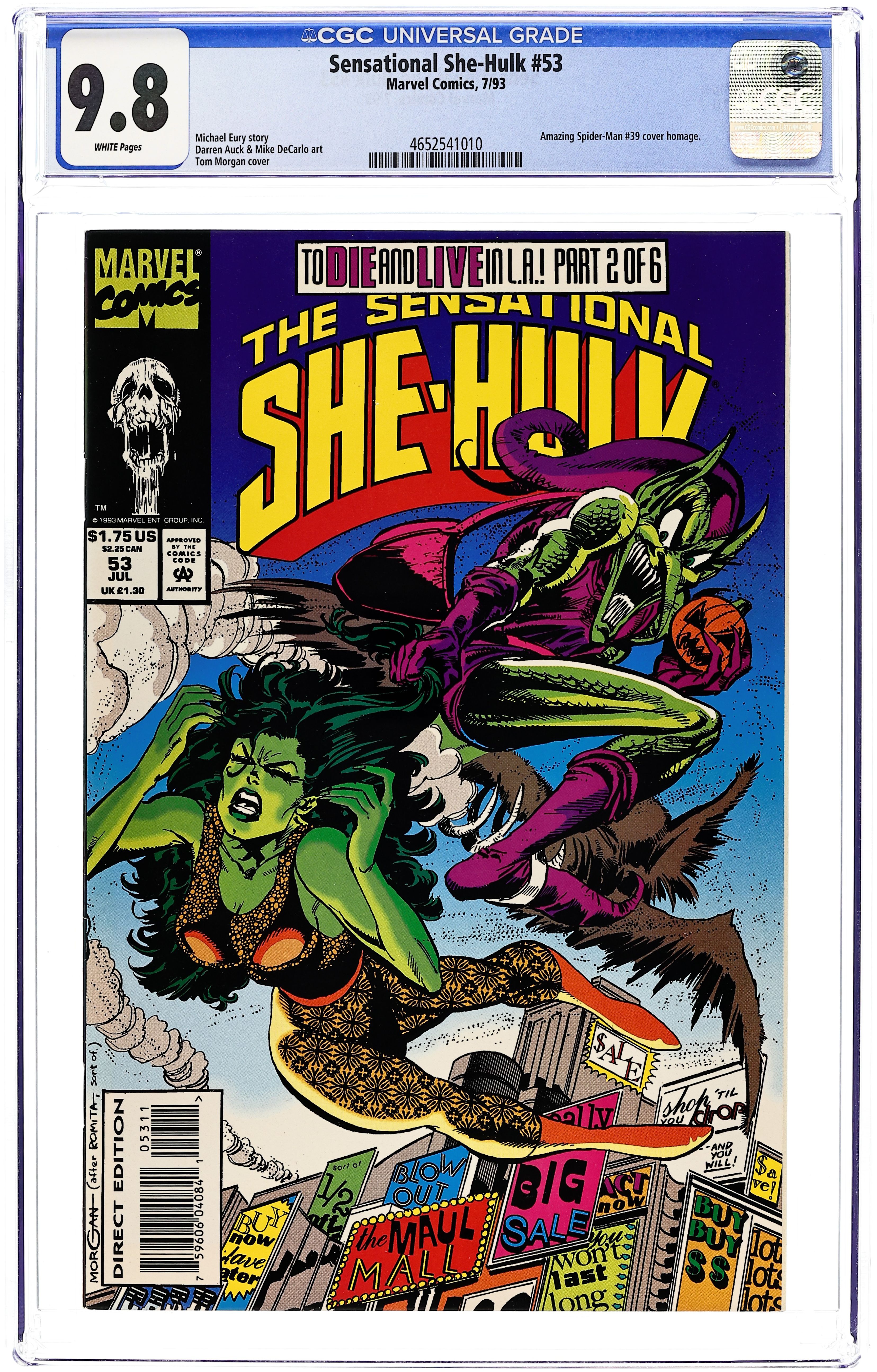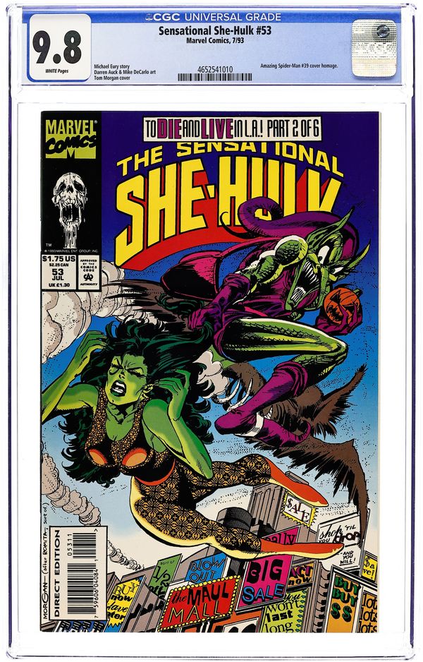 Tags: Marvel Legacy Numbering: She-Hulk (part 78)$15.00Cover art by Tom Morgan. To Die and Live in L.A.! Part 2 of 6: Death Becomes Her, script by Michael Eury, pencils by Darren Auck, inks by Mike DeCarlo; She-Hulk is dead; How will she view the afterlife? Cover art is an homage to the cover of The Amazing Spider-Man #39. 36 pgs. $1.75. Cover price $1.75.