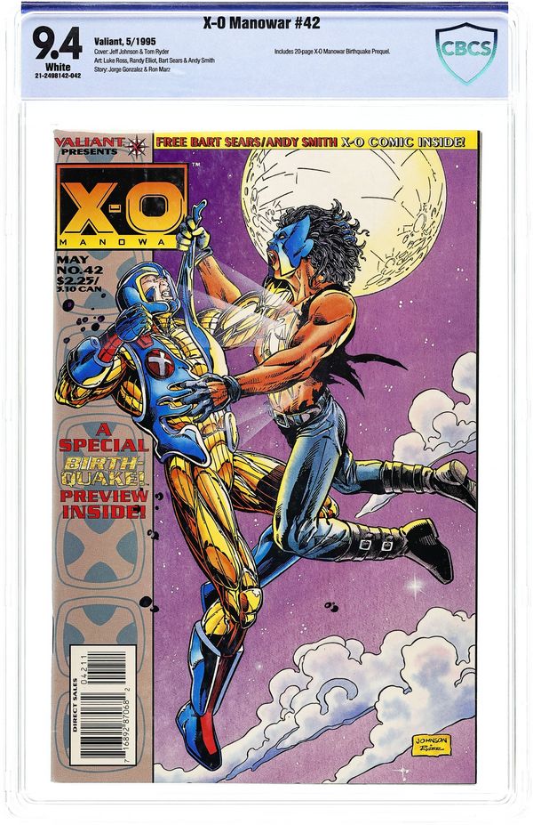 Part 1 of 2. X-O Manowar is exhausted. Having barely survived 'The Wolfbridge Affair,' and still at a standstill in his relationship with Randy, he heads down to the Big Easy for a well-deserved vacation. Things don't remain quiet for long, however, as X-O and his assistant Ken become entangled with New Orleans' champion of the night, Shadowman! Continues in Shadowman (1992 1st Series) #37. "First Impressions" is written by Jorge Gonzalez, with art by Luke Ross and Randy Elliott. Plus: a special 16-page X-O Manowar Birthquake prequel tale by Ron Marz, Bart Sears, Andy Smith and Ray Kryssing. Cover by Jeff Johnson and Tom Ryder. Cover price $2.25.