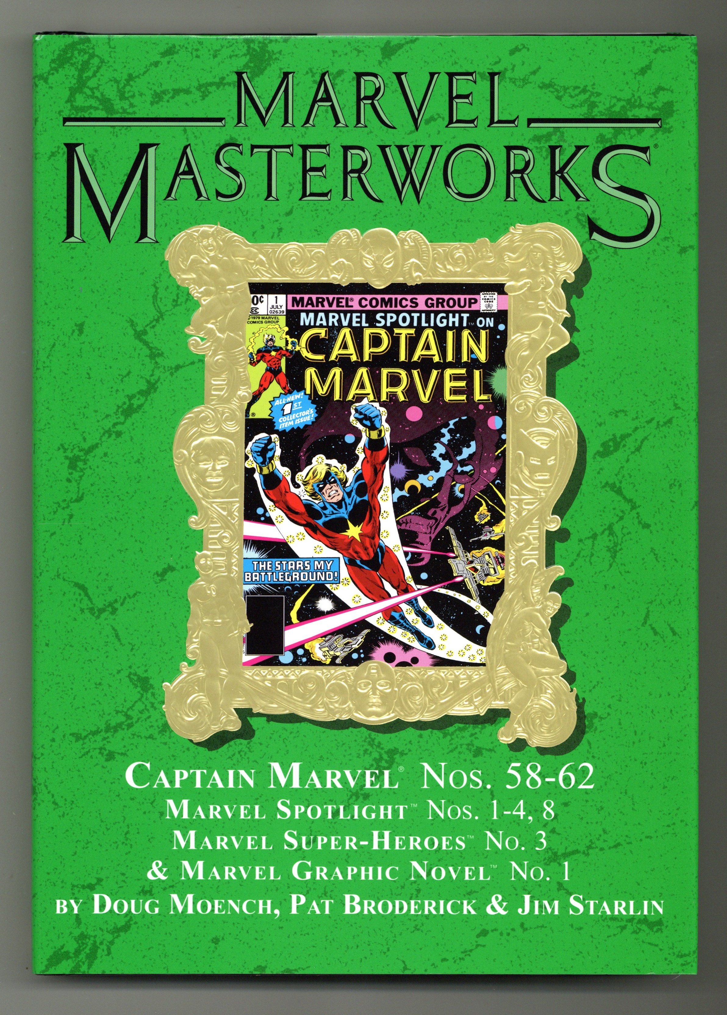 Volume 232 - 1st printing. "Captain Marvel: Book 6!" Collects Captain Marvel (1968-1979 1st Series Marvel) #58-62, Marvel Spotlight (1979-1981 2nd Series) #1-4 and #8, Death of Captain Marvel GN (1982 Marvel) and material from Marvel Super Heroes (1990-1993 2nd Series) #3. Cover by Jeff Aclin. The Marvel Masterworks once again presents Captain Marvel -- and this volume completes his adventures! From the epic Battle of Titan to the all-time classic Death of Captain Marvel, you can now experience every page of Mar-Vell's cosmic quest in painstakingly restored hardcover editions. The action begins with a plan set in motion by Thanos's death: the worldwide computer ISAAC has taken control of Titan in Thanos's name! To overcome this deadly threat, Captain Marvel and Drax the Destroyer must fight a war on two fronts that spans the entire solar system. Art turns by Steve Ditko and Frank Miller, plus a rare tale held over for years, set the stage for Jim Starlin's touching farewell to Mar-Vell. Hardcover, 296 pages, full color. NOTE: Limited to 740 copies. Cover price $75.00.