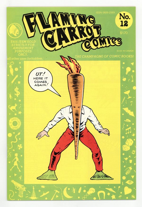 Cover art by Bob Burden. The Dead Dog Leaped Up and Flew Around the Room, script and art by Bob Burden; Flaming Carrot battles a dead dog that flies around. Chronicling the hilarious adventures of Bob Burden's post-Dada, neo-surrealist super-hero. 36 pgs. $1.70. Cover price $1.70.