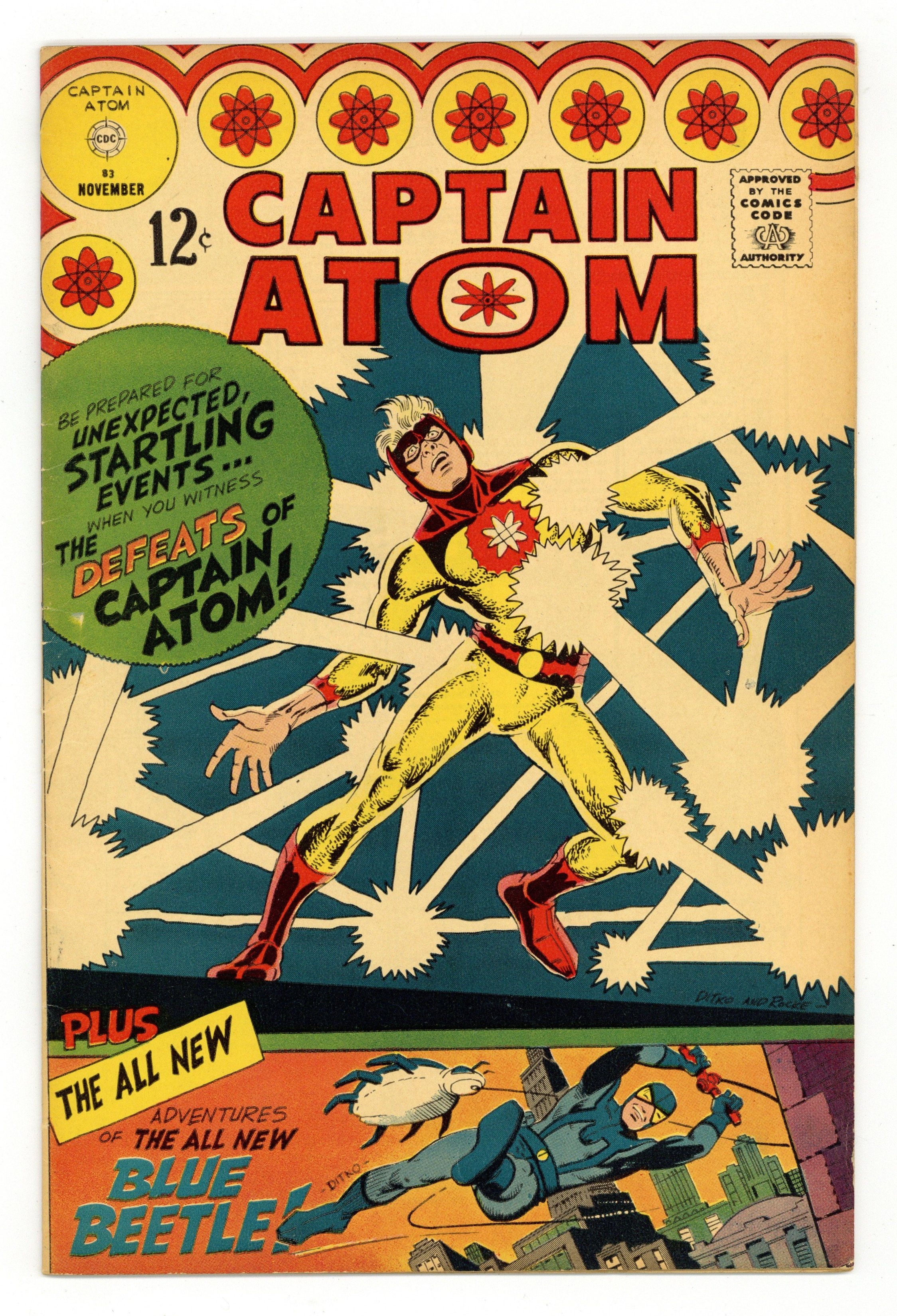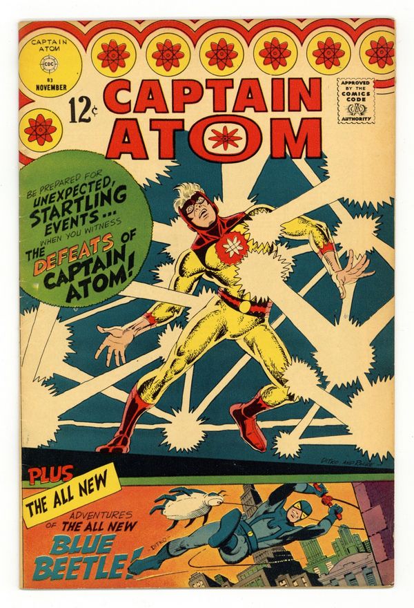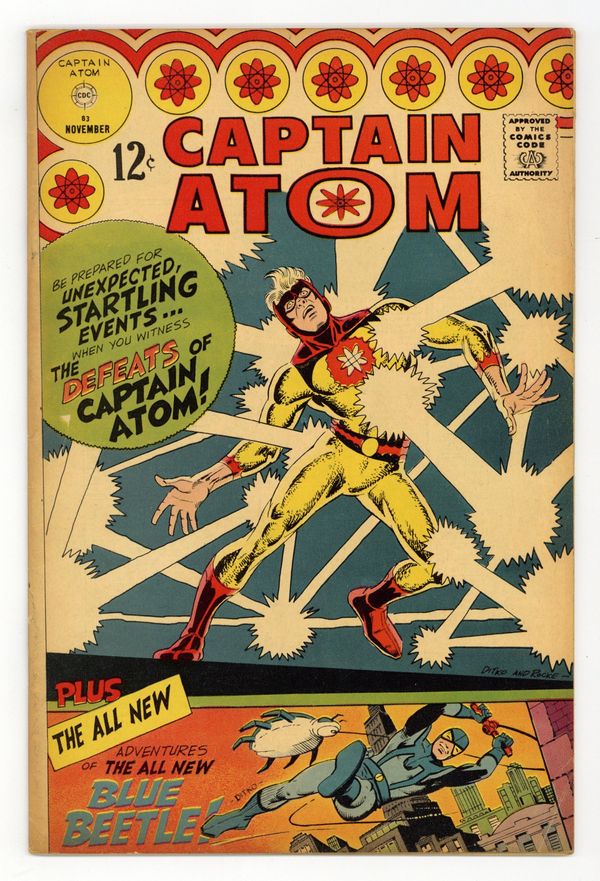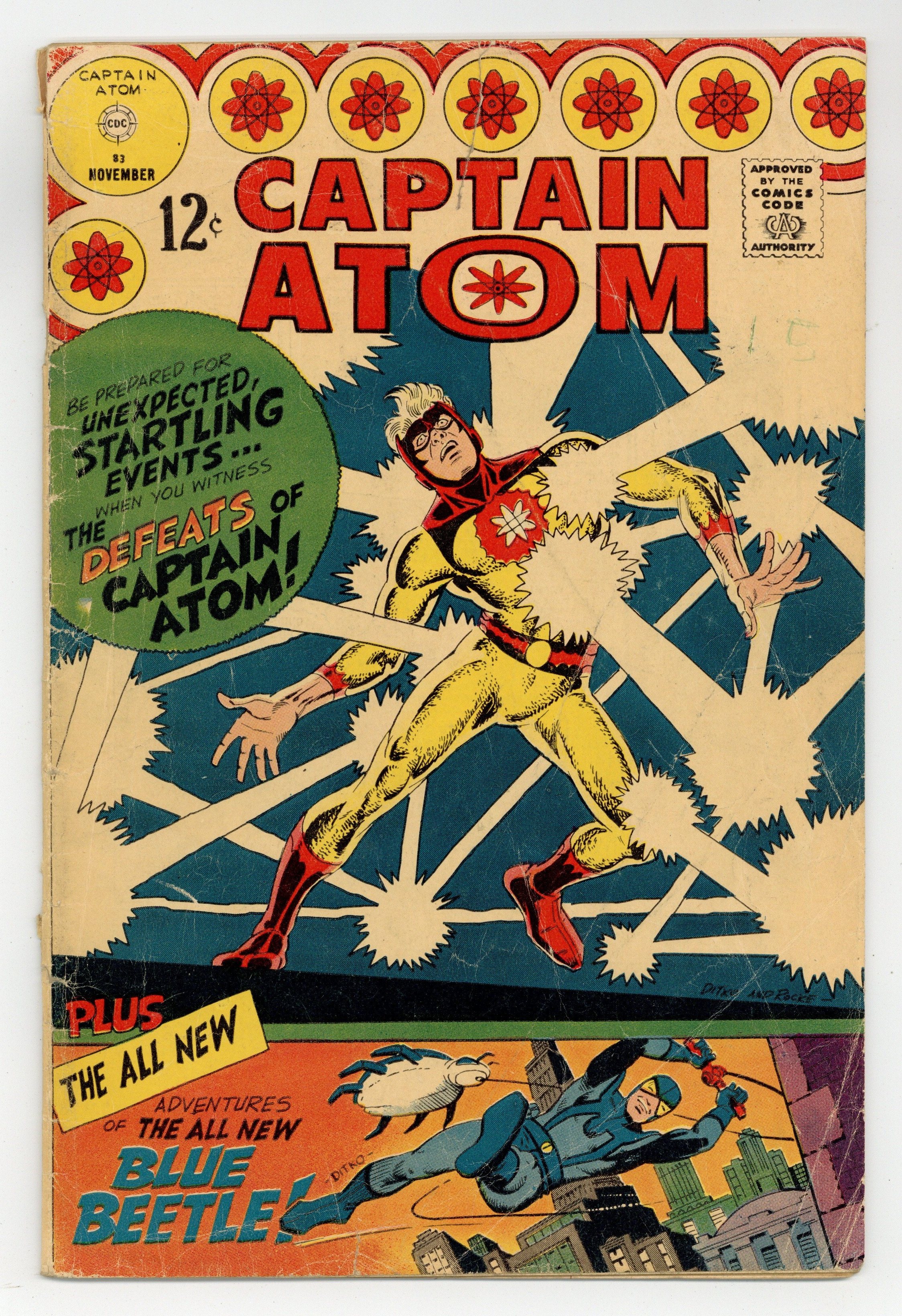 First appearance of Ted Kord (second Blue Beetle). Cover pencils by Steve Ditko, inks by Rocke "Rocke" Mastroserio. Finally Falls the Mighty!, script by Steve Ditko (plot) and David Kaler, pencils by Steve Ditko, inks by Rocco "Rocke" Mastroserio; Captain Atom loses his powers; cameo by Iron Arms. The New Blue Beetle, script by Steve Ditko (plot) and Gary Friedrich, art by Steve Ditko; intro of Blue Beetle/Ted Kord. 36 pgs. $0.12. Cover price $0.12.
