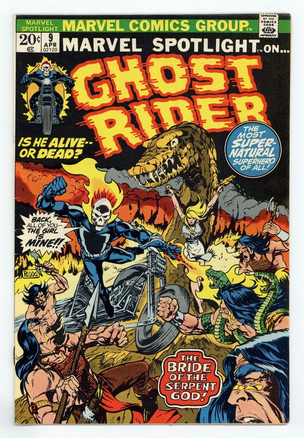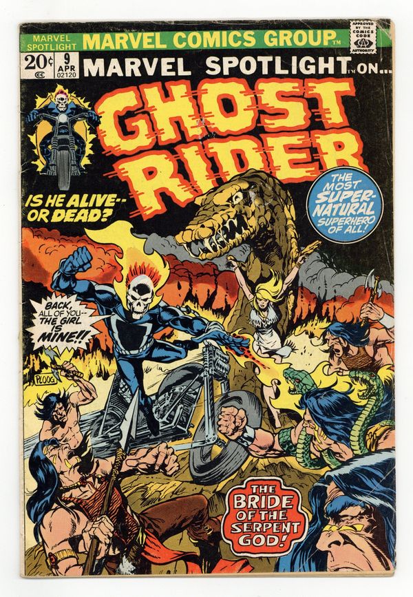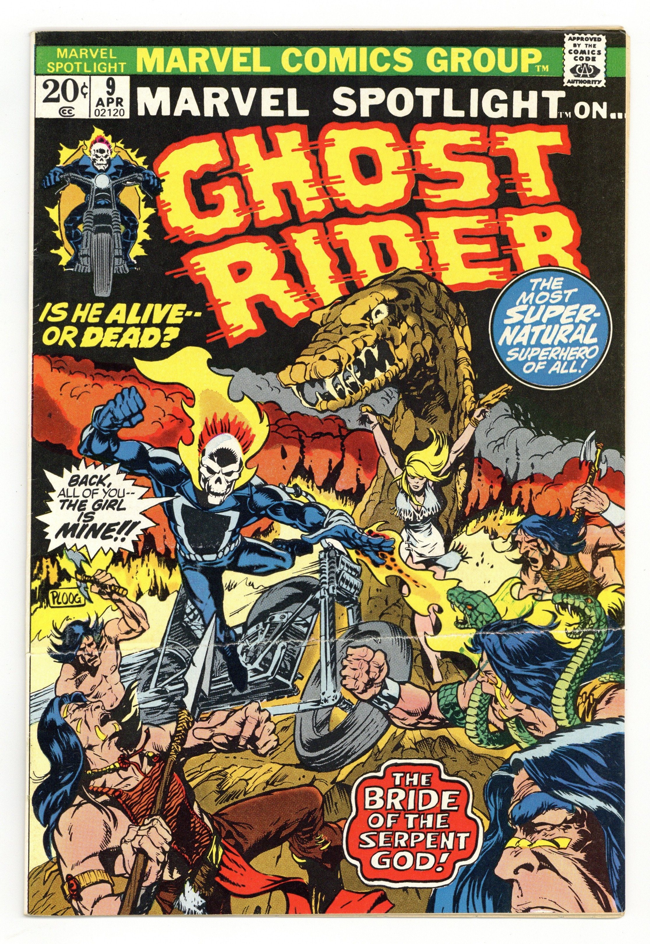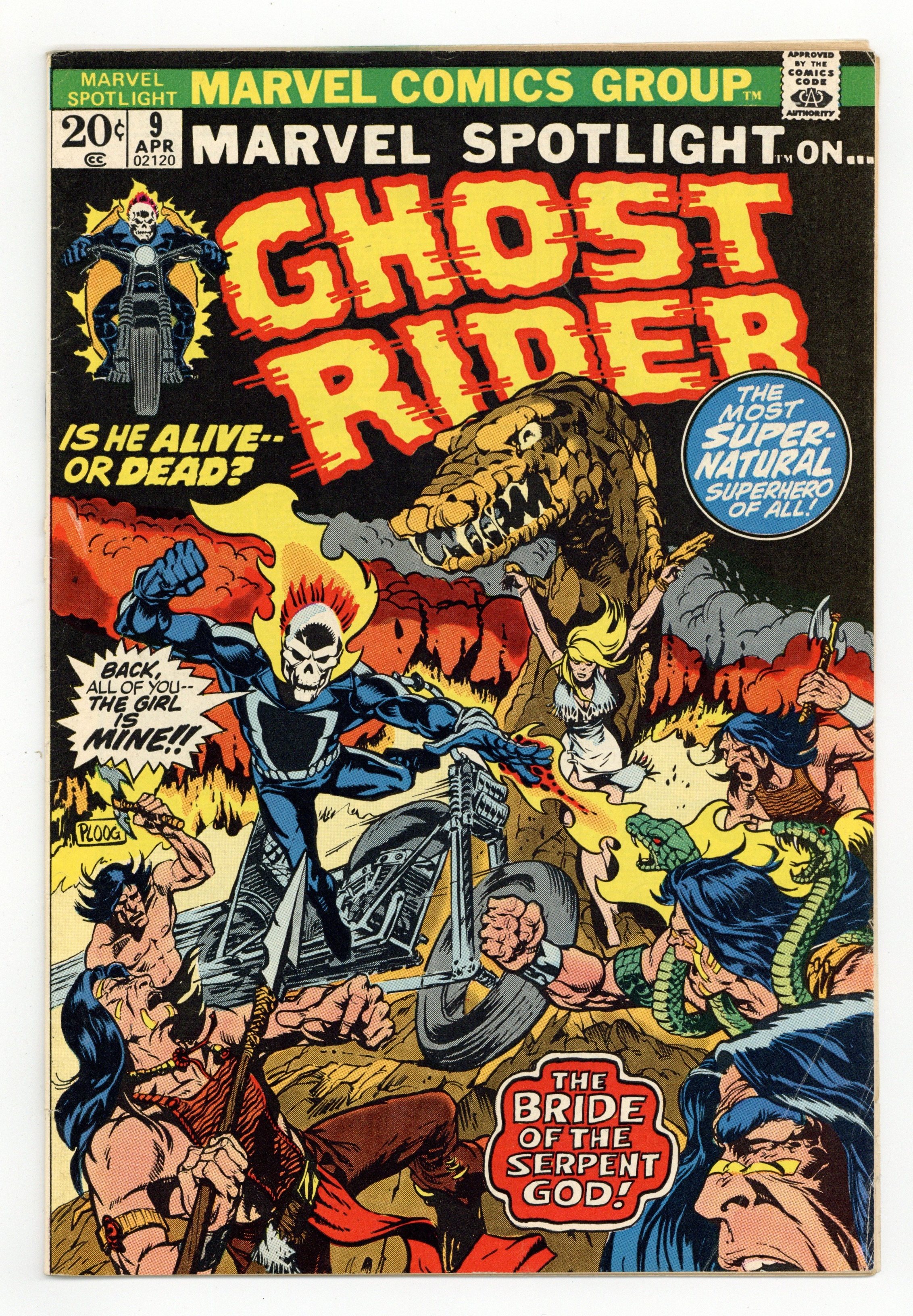 Cover art by Mike Ploog. The Snakes Crawl At Night, script by Gary Friedrich, pencils by Tom Sutton, inks by Chic Stone; everyone believes Johnny Blaze is dead when he falls down Copperhead Canyon; Sam Silvercloud kidnaps Roxanne. 36 pgs. $0.20. Cover price $0.20.