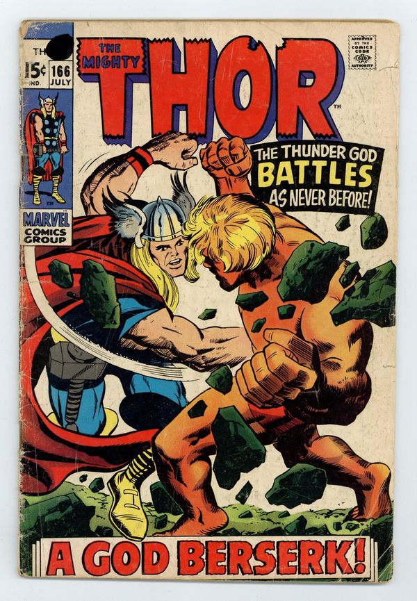 First 15-cent cover price. Cover pencils by Jack Kirby and John Romita (alterations), inks by Vince Colletta and John Romita (alterations). Second Adam Warlock appearance ("Him") in "A God Berserk!", script by Stan Lee, pencils by Jack Kirby, inks by Vince Colletta; After Adam Warlock takes off with Sif, Thor picks up his hammer and starts swinging!; A battle of brawn and rage ensues between two divine beings!; Will Thor fully succumb to the ailment Asgardians call "Warrior Madness?"; After a previous hiccup, Karnilla recovers her plot to gain Balders love; What sorcery does Haag have up her sleeve this time? 36 pgs., full color. NOTE: 2nd Appearance of Adam Warlock ("HIM"). Cover price $0.15.