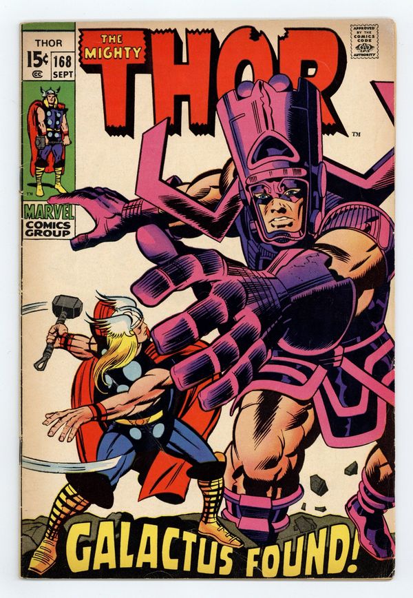 Cover pencils by Jack Kirby, inks by Joe Sinnott. Galactus origin, part 1 in "Galactus Found!", script by Stan Lee, pencils by Jack Kirby, inks by George Klein; Thor takes the Odinship in search of Galactus; Galactus captures the Odinship and begins to tell his origin to Thor; Meanwhile, on Earth, a foreign country completes their creation of the Thermal Man and rockets him to the US to wreak havoc. Appearances by Balder, Hogun, Fandral, Volstagg, the Watcher, and Odin. First appearance of the Thermal Man. Bullpen Bulletins. 36 pgs., full color. $0.15. Cover price $0.15.