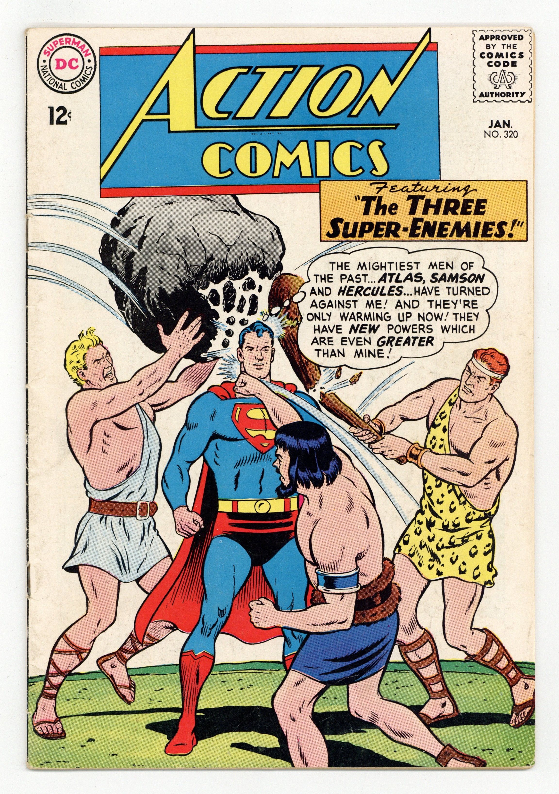 Cover pencils by Curt Swan, inks by George Klein. Samson, Atlas, and Hercules gang up on Superman in "The Three Super-Enemies!", script by Otto Binder, art by Curt Swan (splash) and Al Plastino; To protect his secret identity, Superman is forced to call three heroes from the past to stop a gang of criminals menacing Metropolis, but he accidentally draws them from a parallel world where the heroes are really villains. "The Man Who Broke Supergirl's Heart," script by Leo Dorfman, art by Jim Mooney; Interplanetary criminals Bronar and Skoll create an android whose mission is to make Supergirl fall in love with him so that he can lure her into a trap where her super-powers will be stolen. 80 Page Giant Superman Annual ad. John F. Kennedy is featured in a one-page public service announcement, "Salute to Courage." 36 Pages, Full Color. $0.12 Cover price $0.12.