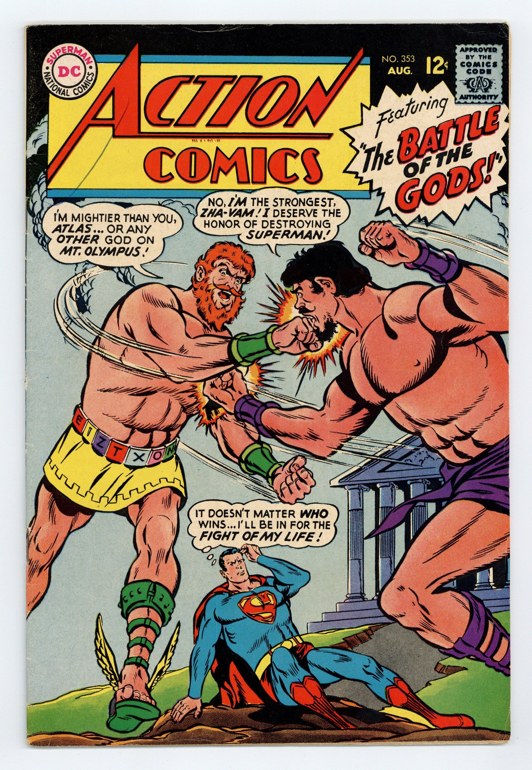 Cover by Wayne Boring. "The Battle of the Gods!", script by Otto Binder, art by Wayne Boring; Zha-Vam blocks Superman from returning to Earth by using the mythical Shield of Orion; Superman travels into the past to visit the gods of Olympus to learn the origin of Zha-Vam and the means with which to defeat him. "The Cosmic Collectors!", script by Otto Binder, art by Jim Mooney; Supergirl is captured and taken to the planet Zorkia by the Living Library, a collection of disembodied brains that travel the universe to collect information. Superman's Pal, Jimmy Olsen ad. 36 Pages, Full Color. $0.12 Cover price $0.12.