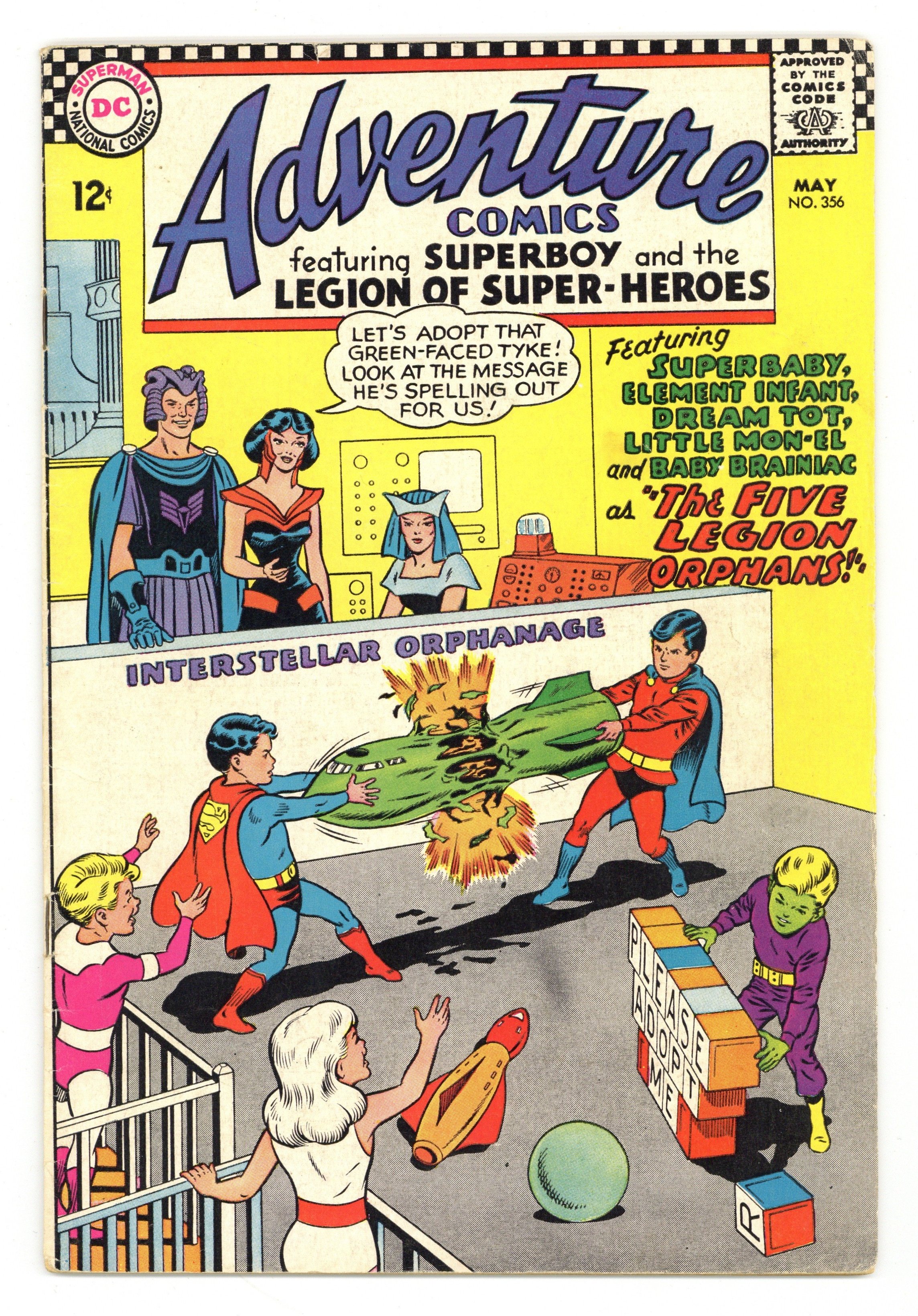 Cover pencils by Curt Swan, inks by George Klein. The Five Legion Orphans!--Tales of the Legion of Super-Heroes, script by E. Nelson Bridwell, pencils by Curt Swan, inks by George Klein; The five Legion orphans are de-aged to toddlers and adopted by families who can't have children. Lana Lang and the Legion of Super-Heroes, script by Otto Binder, art by George Papp; Lana uses Star Boy in an attempt to make Superboy jealous. Letter to the editor from Mark Evanier. Letter to the editor from comics writer Mark Evanier. 36 Pages, Full Color. Cover price $0.12.