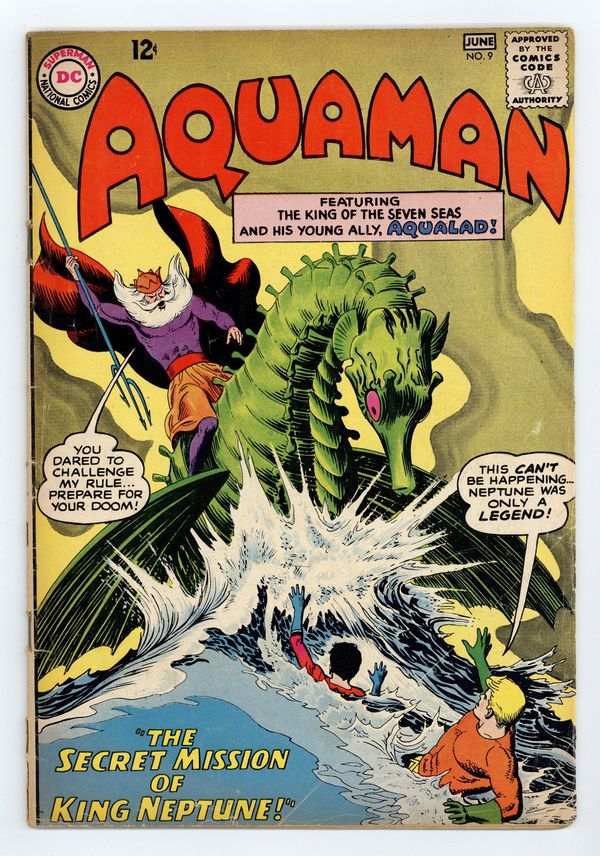 Cover art by Nick Cardy. The Secret Mission of King Neptune, art by Nick Cardy; Aquaman, Aqualad, and Captain Crane locate the entrance to the kingdom of Neptune; Crane turns into Neptune. Records of the Sea fact page, art by Henry Boltinoff. Taffrail Talk article. 36 pgs. $0.12. Cover price $0.12.