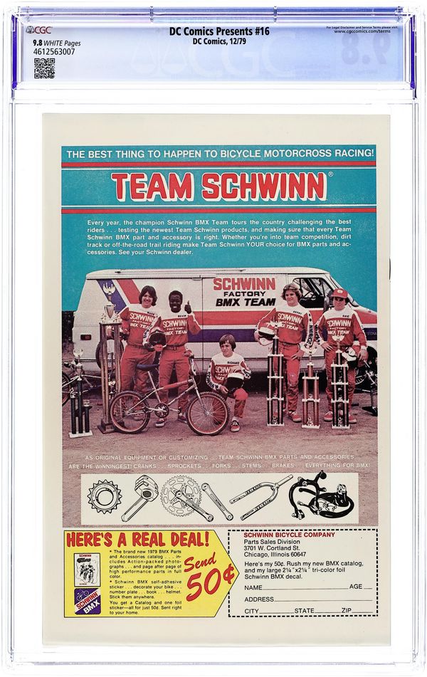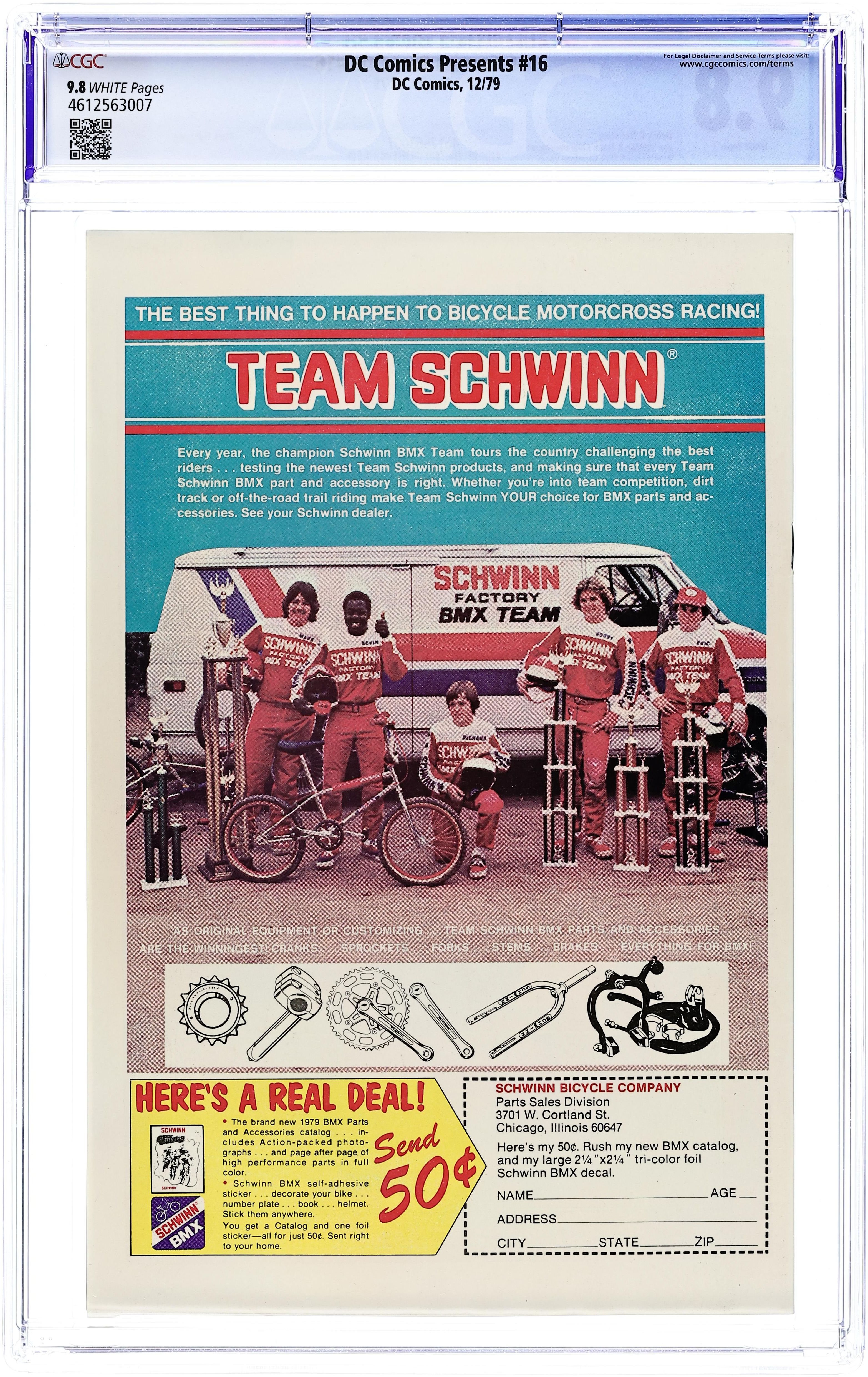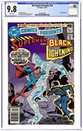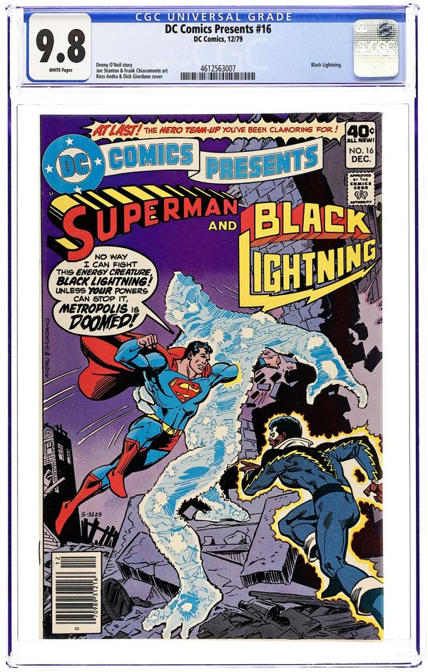 The De-volver! - Written by Denny O'Neil. Art by Joe Staton and Frank Chiaramonte. Cover by Ross Andru and Dick Giordano. Black Lightning stops a robbery on a subway train as it travels through Suicide Slum but causes one of the robbers to inadvertently shoot and kill another passenger, Trina. This angers Trina's boyfriend, Hugh Bryant, who is also one of Jefferson Pierce's students. Hugh, actually an alien trapped on Earth for millions of years, "devolves" into his true form as an energy creature. Black Lightning and Superman subdue the creature and help him finally leave the planet. Characters in this issue: Superman [Clark Kent]; Black Lightning [Jefferson Pierce]; Lois Lane; Jimmy Olsen; Trina (introduction, death); Hugh Bryant (introduction, origin, villain). Also: The Flash in 1-page Hostess Fruit Pies ad "The Stony-Eyed Medusa" with art by Curt Swan and Vince Colletta. 32 pages, full color. Cover price $0.40.