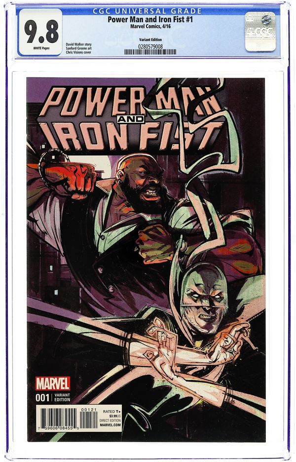 Limited 1 for 25 Retailer Incentive Variant Cover. Written by David Walker. Art by Sanford Greene. Cover by Chris Visions. THE ORIGINAL HEROES FOR HIRE, BACK ON THE CLOCK! We KNOW you've been waiting to see LUKE CAGE and DANNY RAND back together and back to STREET-STOMPING basics! POWER MAN and IRON FIST are tracking a mystery with all the ingredients of a classic Heroes-for-Hire tale. Expect old friends, hired goons, crime lords, weird magic, plenty of power, a flurry of fists and as much bromance as you can handle! 28 pages, full color. Rated T+ Cover price $3.99.