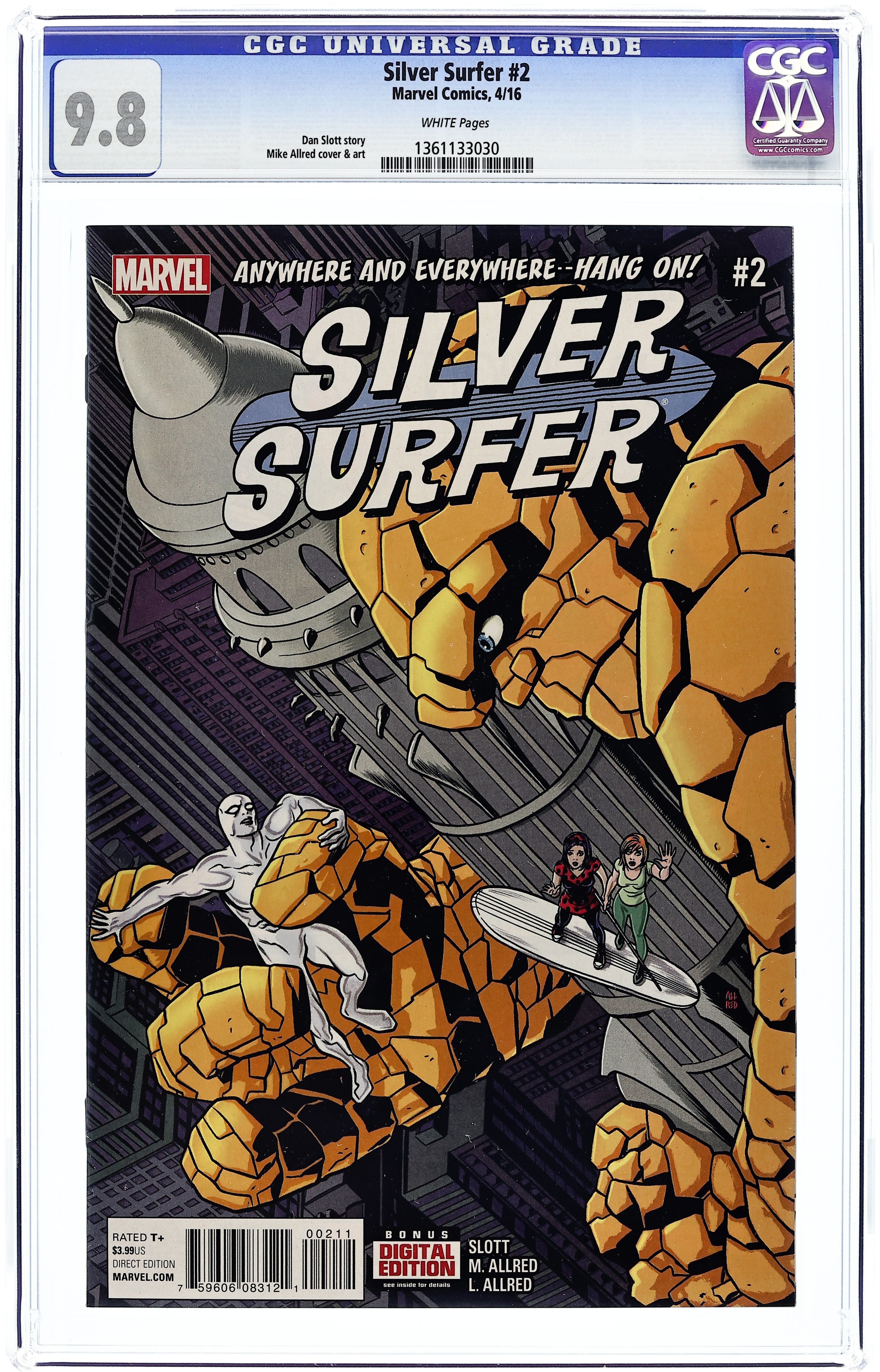 Written by Dan Slott. Art and Cover by Mike Allred. Why is Silver Surfer fighting the ever-loving blue-eyed THING? Who is this Alicia Masters person, and why hasn't Norrin told Dawn about her before? Where did that alien armada come from? What can they really do to planet Earth that is WORSE THAN DEATH?! And WHEN, exactly, IS Clobbering Time?! Right now, True Believer! RIGHT NOW! 28 pages, full color. Rated T+ Cover price $3.99.