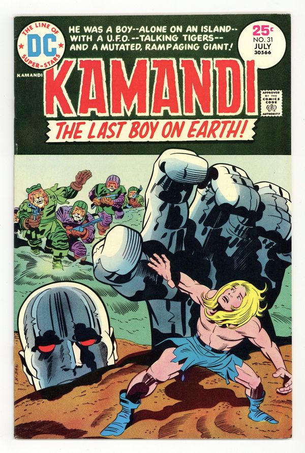 "The Gulliver Effect." Script and pencils by Jack Kirby, inks by D. Bruce Berry. Cover by Kirby and Berry. Ben Boxer, turned into a metal giant by radiation, attacks Kamandi, Dr. Canus, and Tuftan. Cover price $0.25.