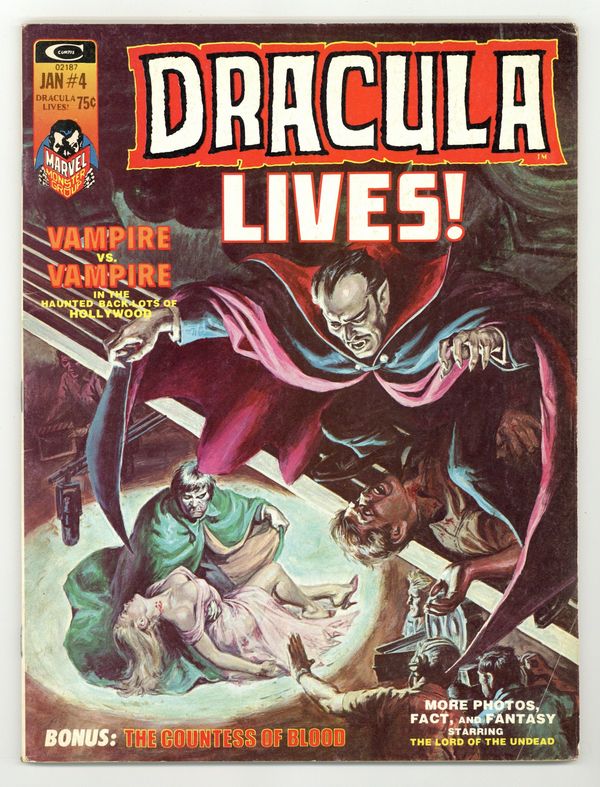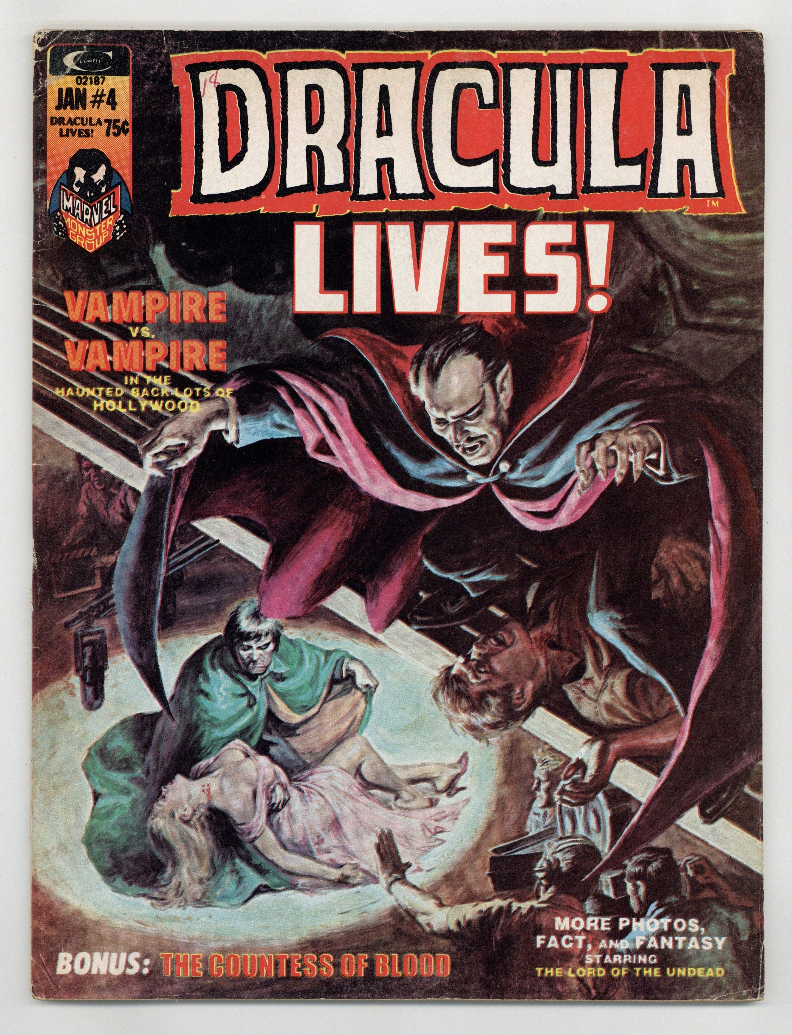 Tags: Vampires$10.75Dracula stars in "Fear Stalker" (script by Marv Wolfman, pencils by Mike Ploog, inks by Ernie Chan as "Ernie Chua"), "This Blood is Mine!" (script by Gardner F. Fox, art by Dick Ayers), and "Look Homeward, Vampire!" (script by Gerry Conway, art by Vicente Alcazar). Reprints: "When Calls the Vampire!" (art by Joe Maneely) and "Of Royal Blood!" (art by Tony Mortellaro). Text features: Chris Claremont reviews "In Search of Dracula" (a book by Raymond T. McNally and Radu Florescu); plus "Transylvania: Vacation Spot of Europe?" (by Dwight R. Decker) and Gerry Boudreau's review of the Christopher Lee film "The Horror of Dracula." Letter to the editor from comics artist Bill Blyberg and comics writer Ralph Macchio. Earl Norem painted cover. Cover price $0.75.