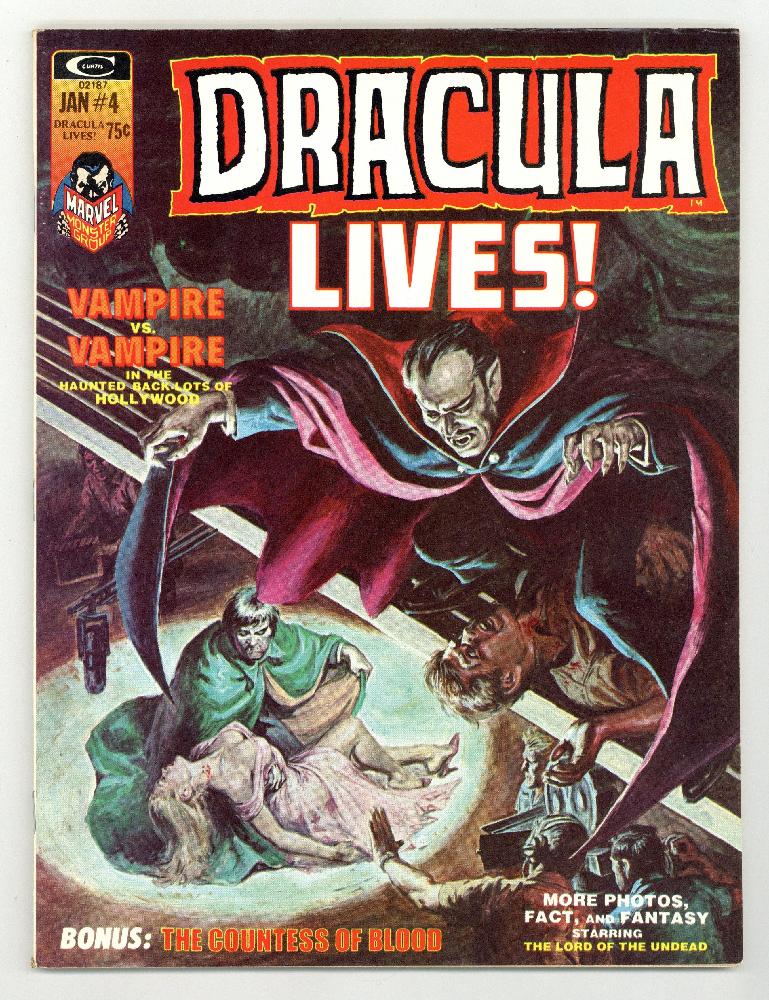 Tags: Vampires$27.00Dracula stars in "Fear Stalker" (script by Marv Wolfman, pencils by Mike Ploog, inks by Ernie Chan as "Ernie Chua"), "This Blood is Mine!" (script by Gardner F. Fox, art by Dick Ayers), and "Look Homeward, Vampire!" (script by Gerry Conway, art by Vicente Alcazar). Reprints: "When Calls the Vampire!" (art by Joe Maneely) and "Of Royal Blood!" (art by Tony Mortellaro). Text features: Chris Claremont reviews "In Search of Dracula" (a book by Raymond T. McNally and Radu Florescu); plus "Transylvania: Vacation Spot of Europe?" (by Dwight R. Decker) and Gerry Boudreau's review of the Christopher Lee film "The Horror of Dracula." Letter to the editor from comics artist Bill Blyberg and comics writer Ralph Macchio. Earl Norem painted cover. Cover price $0.75.