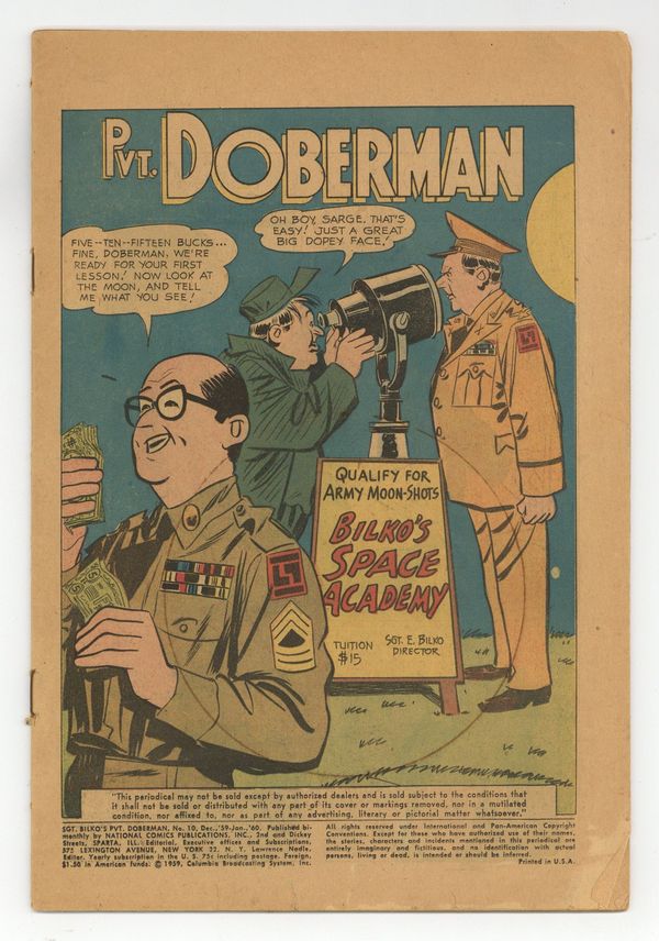 Cover art by Bob Oksner. Bilko's Space Academy, art by Bob Oksner; Bilko tries to con Col. Hall into transferring him to the NASA space academy by staging an invasion of the base by aliens from Venus. This Ain't the Army humor page by Henry Boltinoff. Khaki-Yaks humor page by Henry Boltinoff. 36 pgs. $0.10. Cover price $0.10.