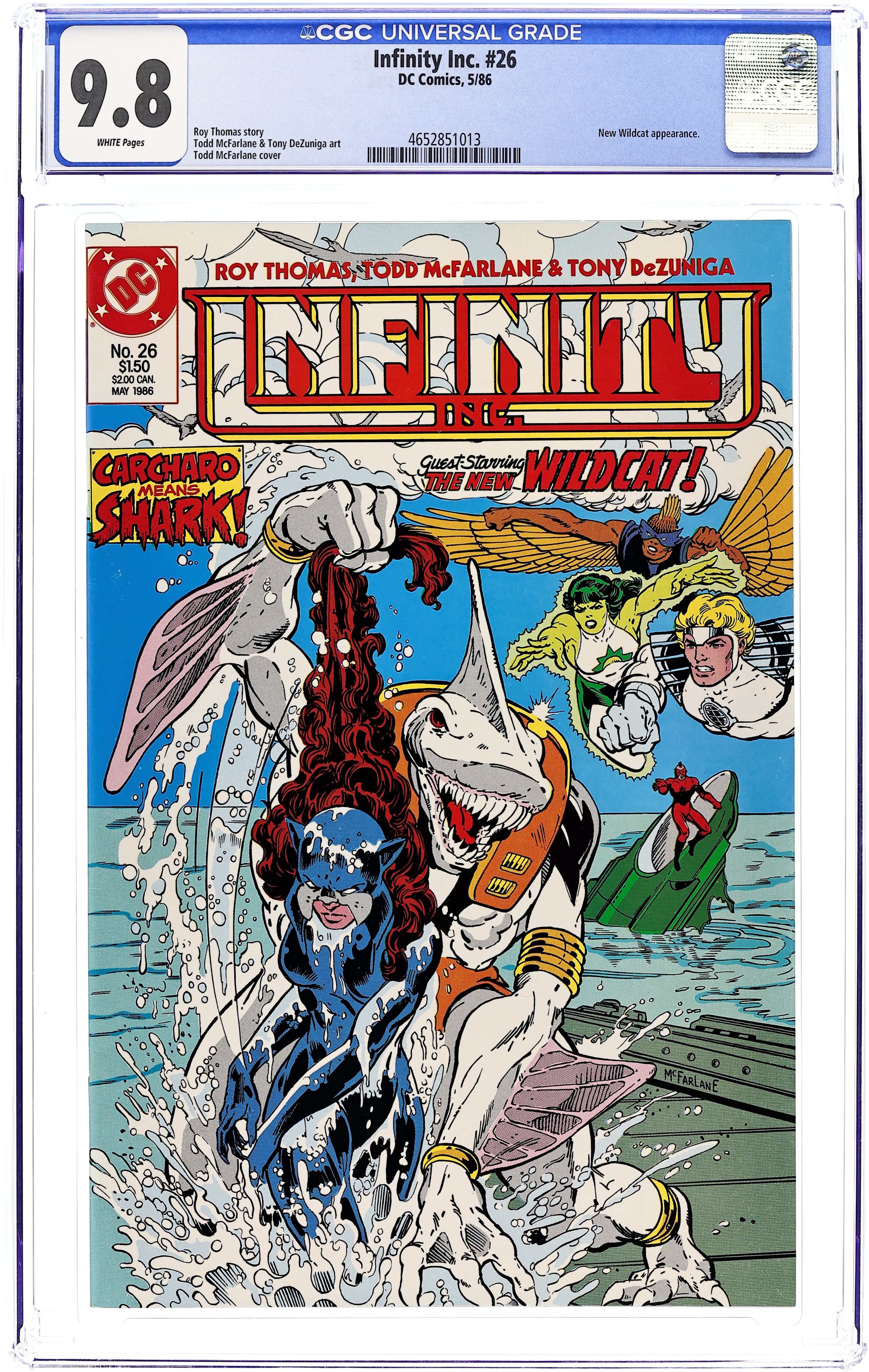 Carcharo and Helix make some startling revelations to the new Wildcat in "Come Helix And High Water!" Part 2 of 2, continued from the previous issue. Script by Roy Thomas, co-plot by Dann Thomas, pencils by Todd McFarlane, inks by Tony DeZuniga. 28 pages of story. McFarlane cover. Cover price $1.50.