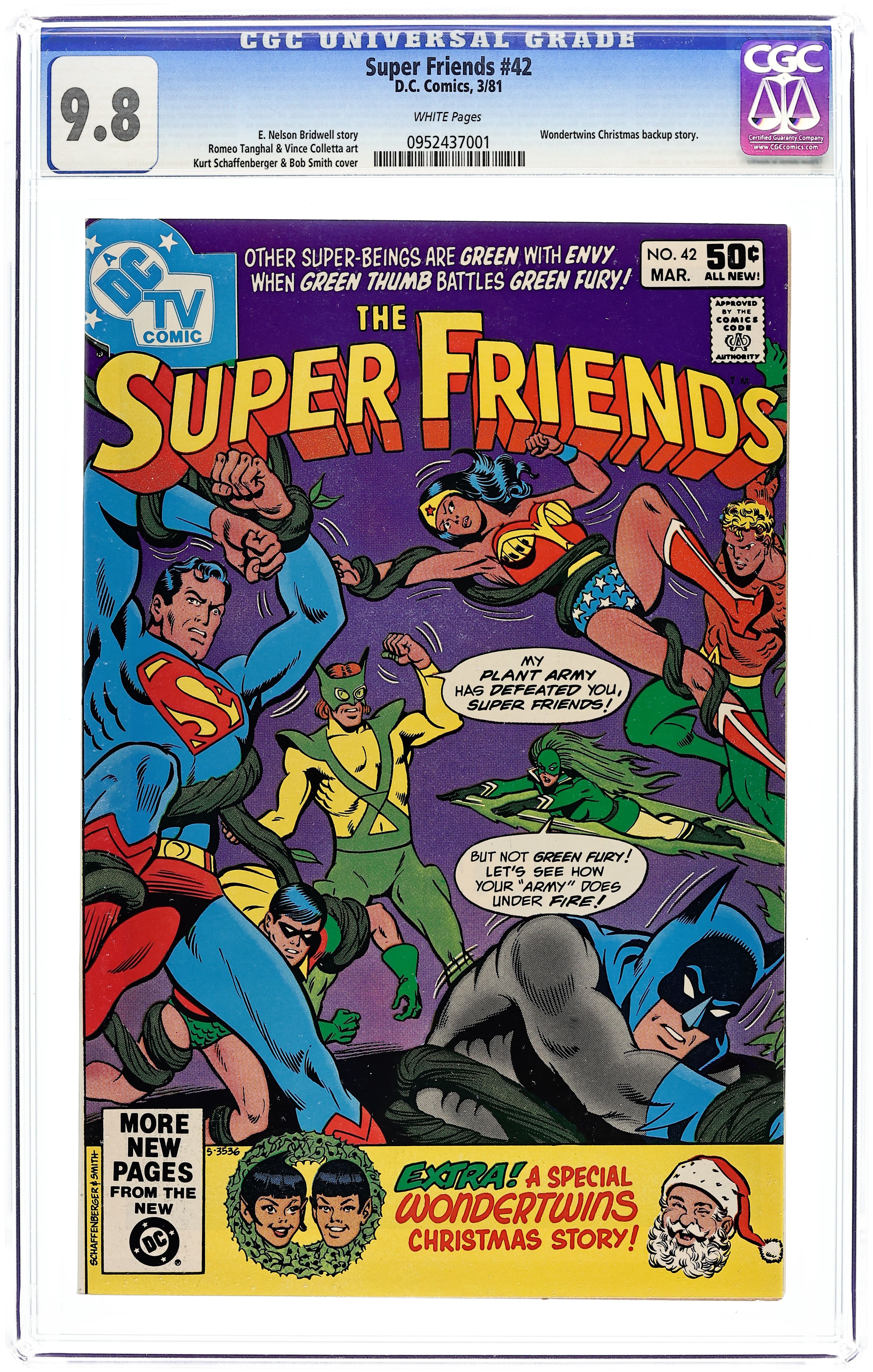 "How Green Was My Gotham." The Super Friends team with the Green Fury to stop the plant-wielding Green Thumb. Starring Aquaman, Batman, Robin, Superman, Wonder Woman, Zan, and Jayna. Script by E. Nelson Bridwell, pencils by Ramona Fradon, inks by Vince Colletta. "Christmas With Everything." Professor Nichols and the Wonder Twins give a generous a kid a special Christmas. Script by Bridwell, pencils by Romeo Tanghal, inks by Colletta. Cover by Kurt Schaffenberger and Bob Smith. Cover price $0.50.