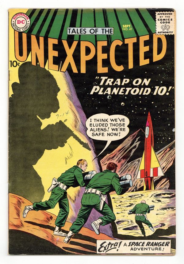 Cover art by Sheldon Moldoff. The Destroyers From The Stars starring Space Ranger, art by Jim Mooney. Water: A Good Friend or Deadly Enemy -- Depending on You! public service announcement, script by Jack Schiff, art by Bernard Baily. Doctor Rocket humor page by Henry Boltinof. The Martian Who Ran For Mayor, art by Nick Cardy. Spiritual Doubles fact half-page by Mort Drucker. How to Use a Space Gun text story. Trap on Planetoid 10, art by George Roussos; men face an alien menace on a mysterious planet. 36 Pages, Full Color. Cover price $0.10.